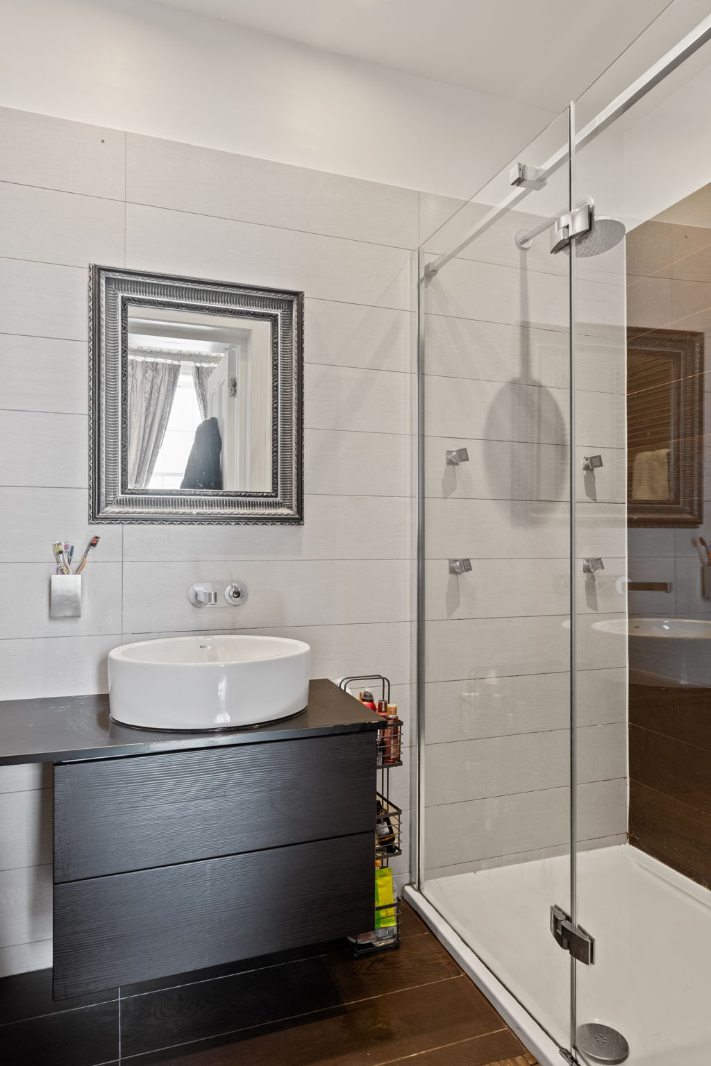 Twin shower, w.c, whb, towel radiator, recessed lights, tiled floor and walls