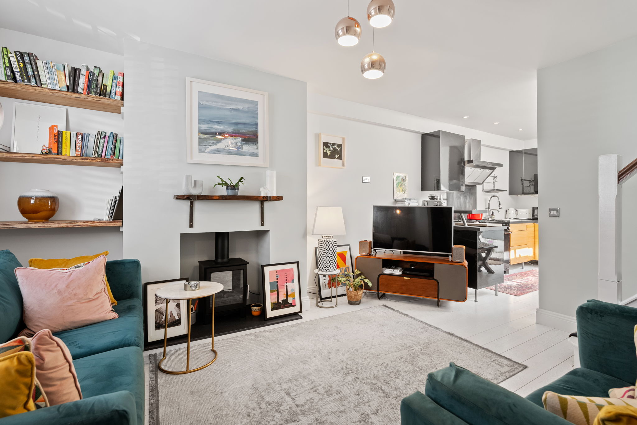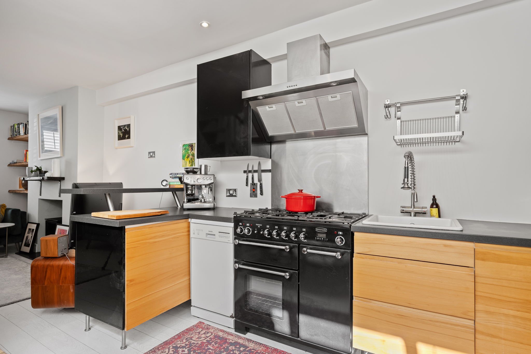 Wide range of modern handless gloss and solid wood units, undermount sink unit, extractor fan, laminate floor, breakfast bar seating. Vaulted ceiling with rooflights and door to yard.