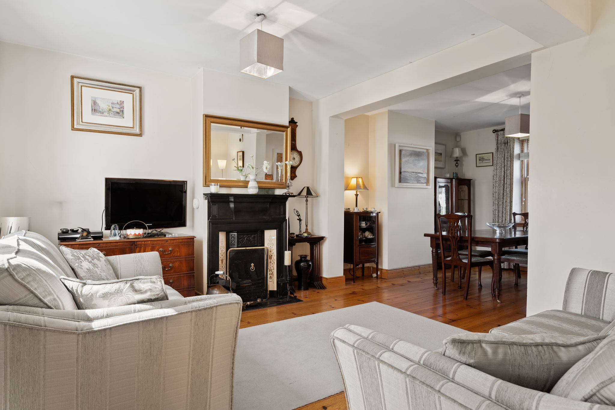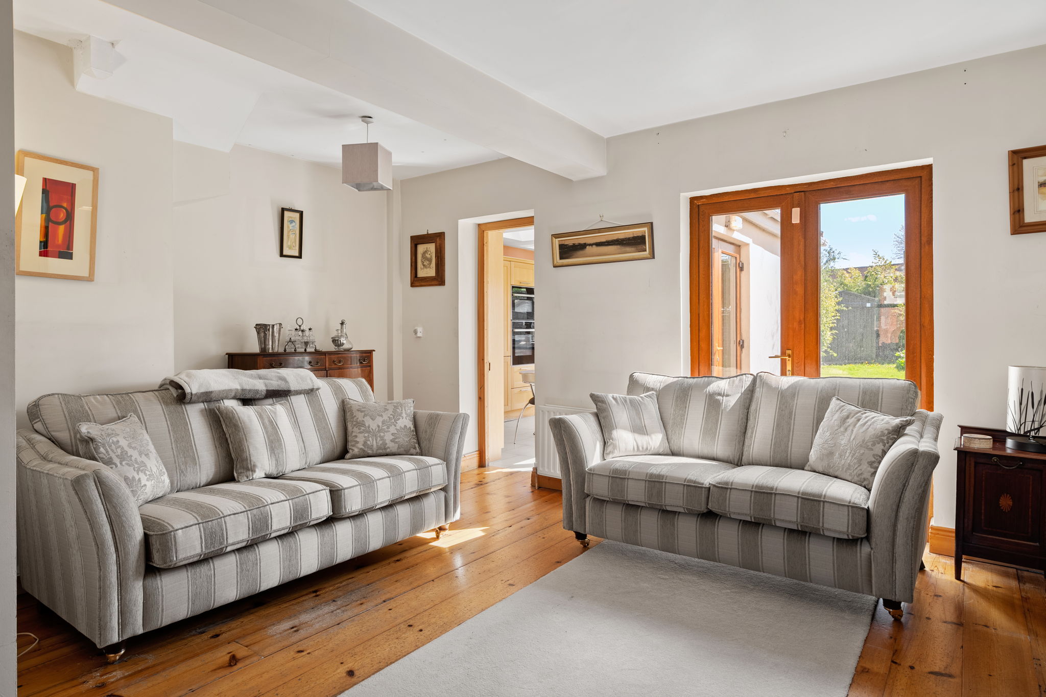 Solid wood floor, understairs storage, open fire with cast iron mantlepiece and tiled insert opening to kitchen off and double doors to garden.