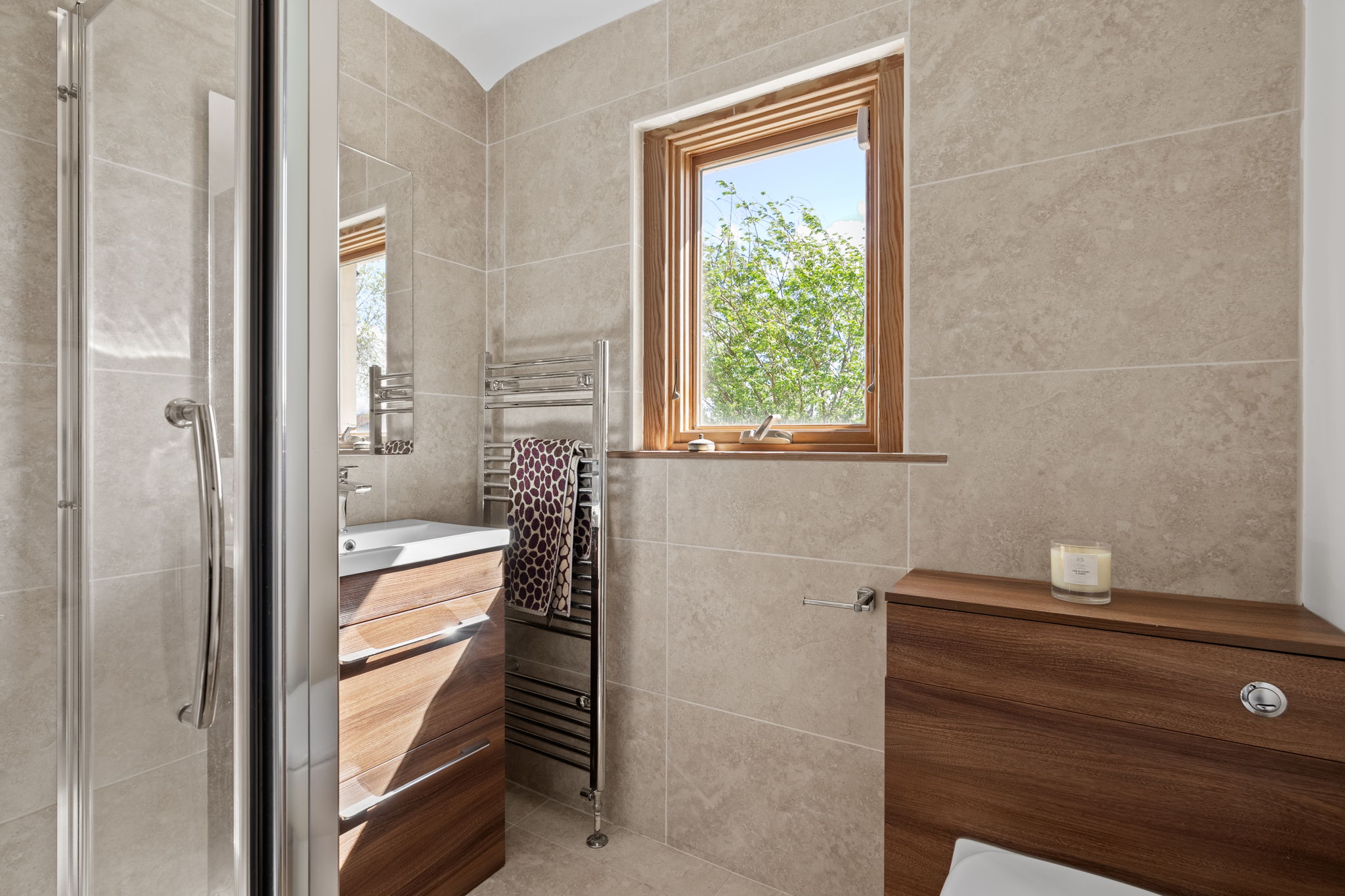 Shower, vanity whb with storage, consealed w.c, towel radiator, tiled floor and walls.