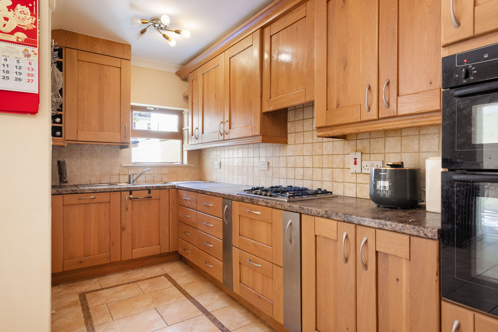 A maple shaker style fully fitted kitchen with floor and wall cupboards and a 4 ring gas range style hob, integrated fridge freezer, dishwasher and tiled flooring.