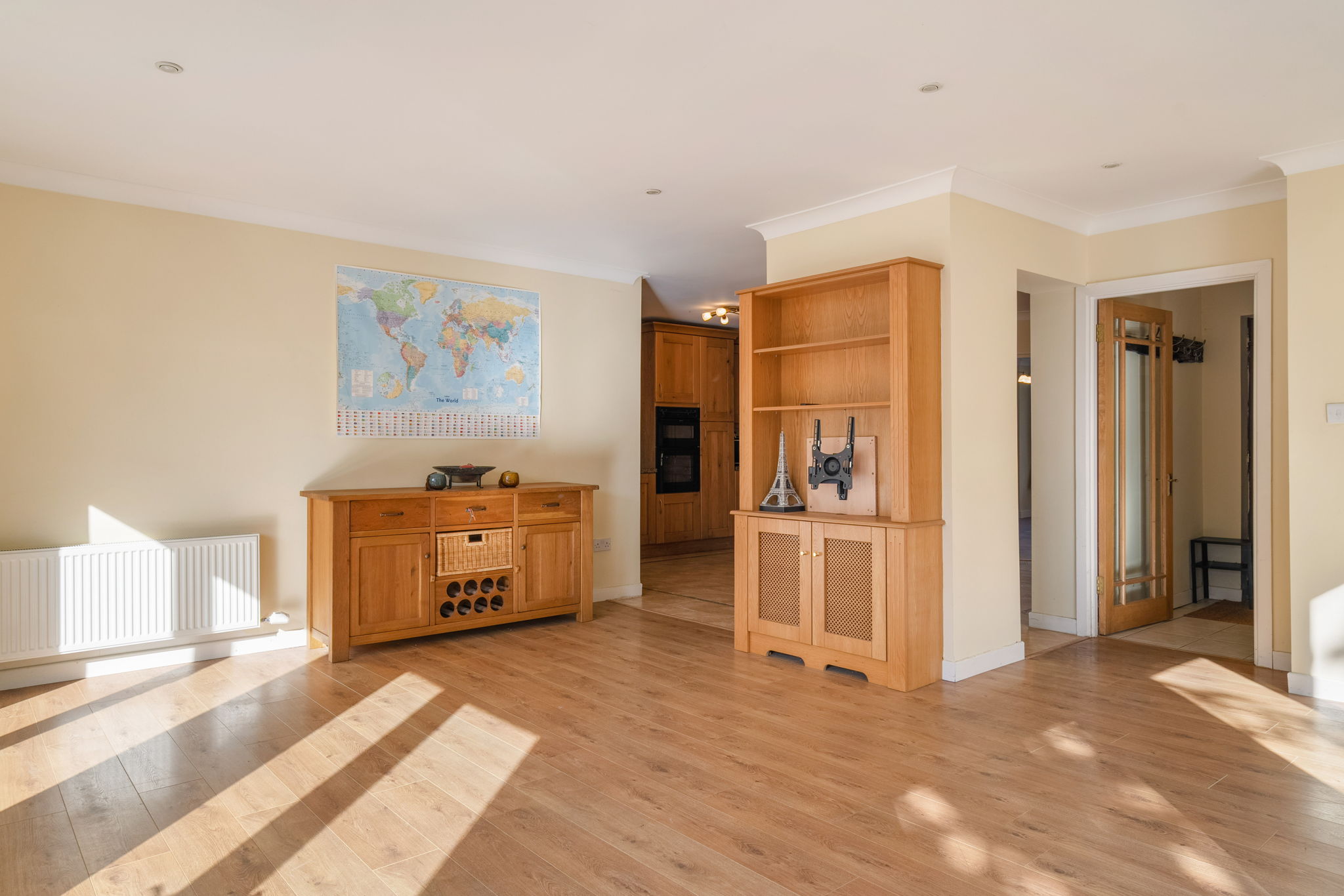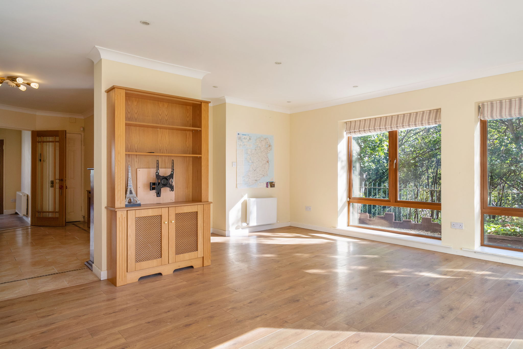 A sizeable and light filled room with dual aspect windows getting the benefit of the morning, afternoon and evening sunlight, timber flooring, recessed lighting and views out across the Dodder woodland and trees to the side of the property. Double doors out to rear garden. Access to side