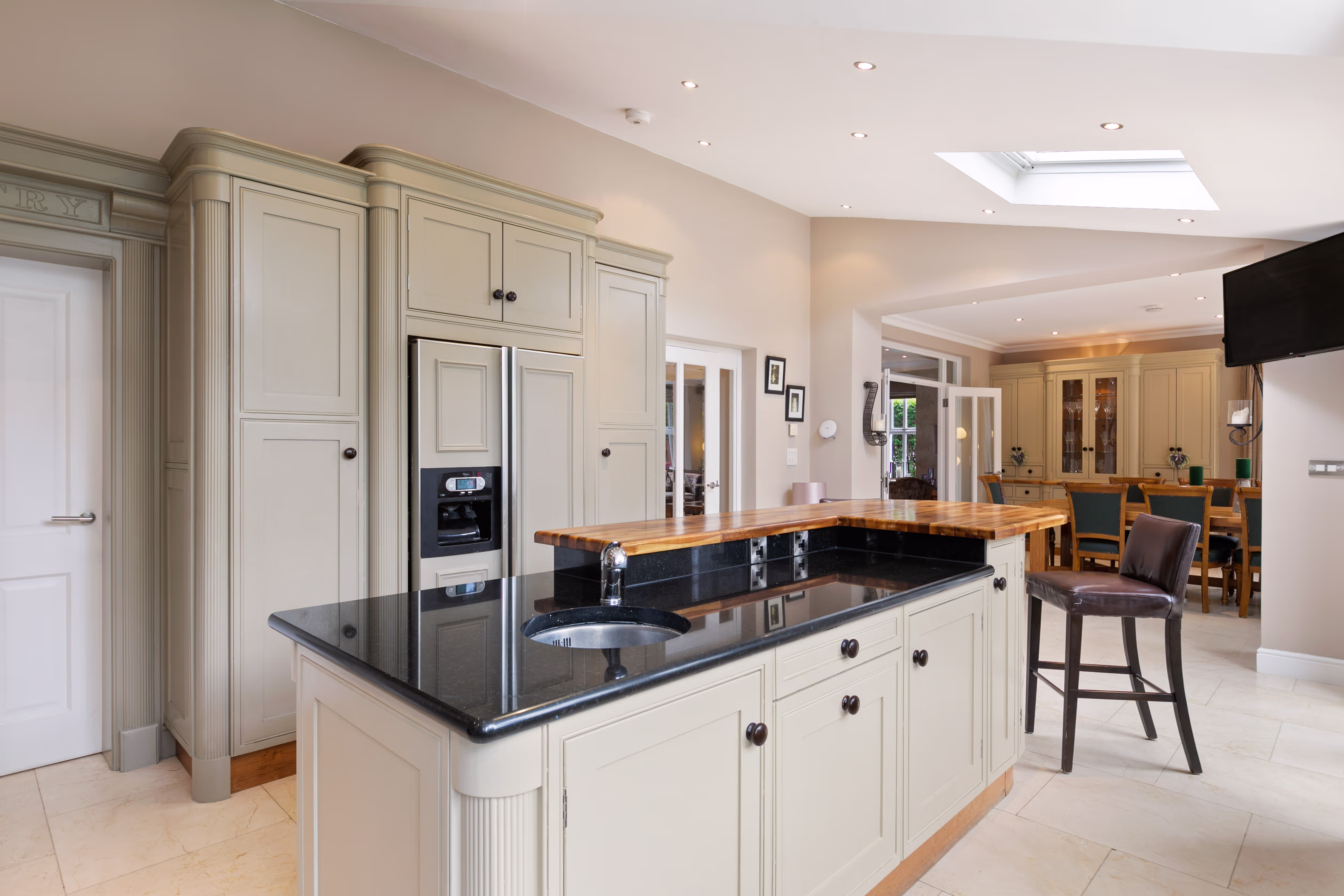 Extensive range of bespoke, in frame solid wood kitchen units by Christoff kitchens, Belfast sink finished with a granite worktop and upstand.