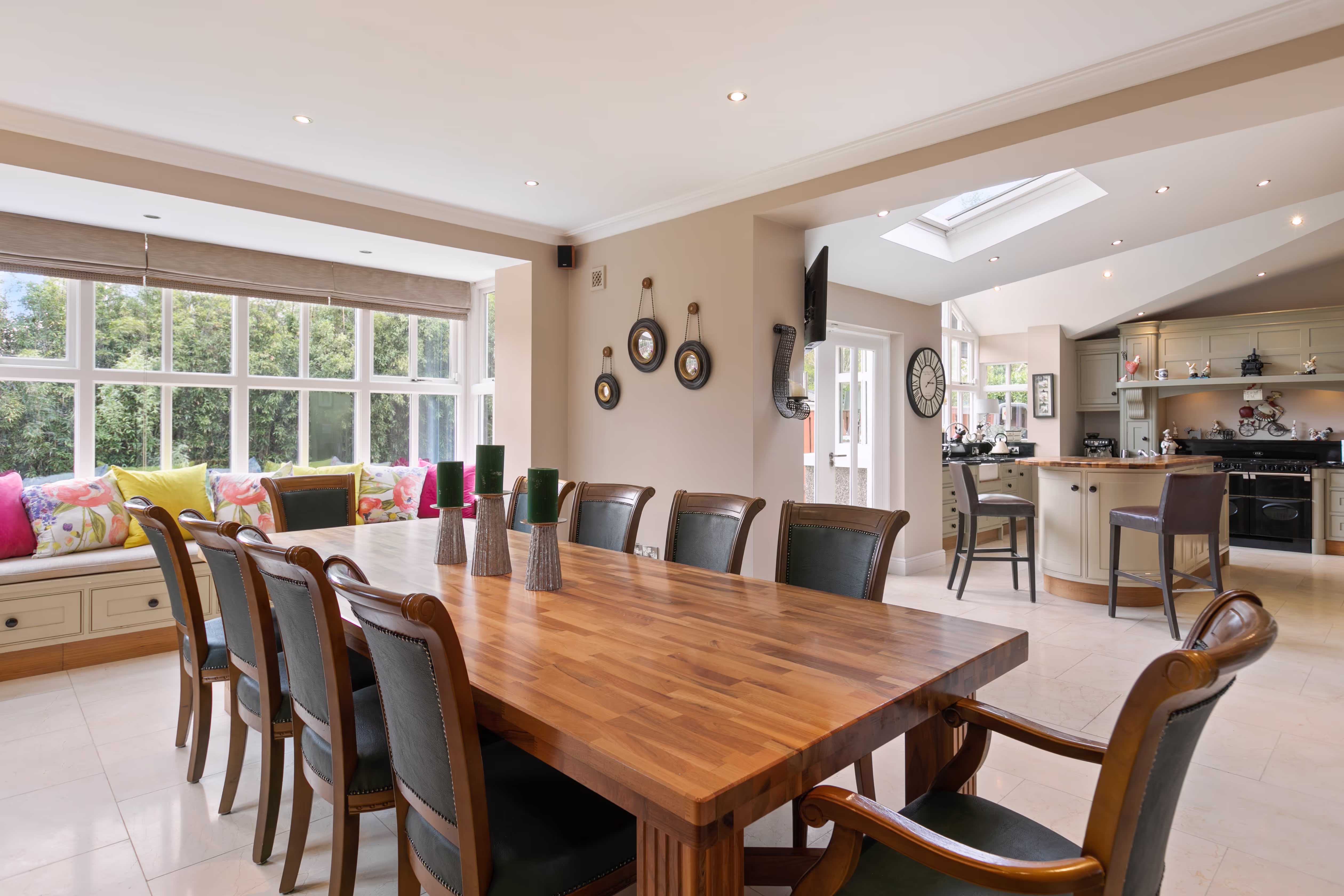 This bright dining room is complete with bay window and bespoke wall unit. Opening to kitchen off with vaulted ceiling and an extensive range of solid in frame kitchen units by Christoff kitchens, Belfast sink and granite worktops. There is an additional island unit with additional storage, undermount sink unit and raised solid walnut breakfast bar. Large utility room off the kitchen with a range of units, granite worktops, built-in full size comms cabinet and plumbed for washing machine.