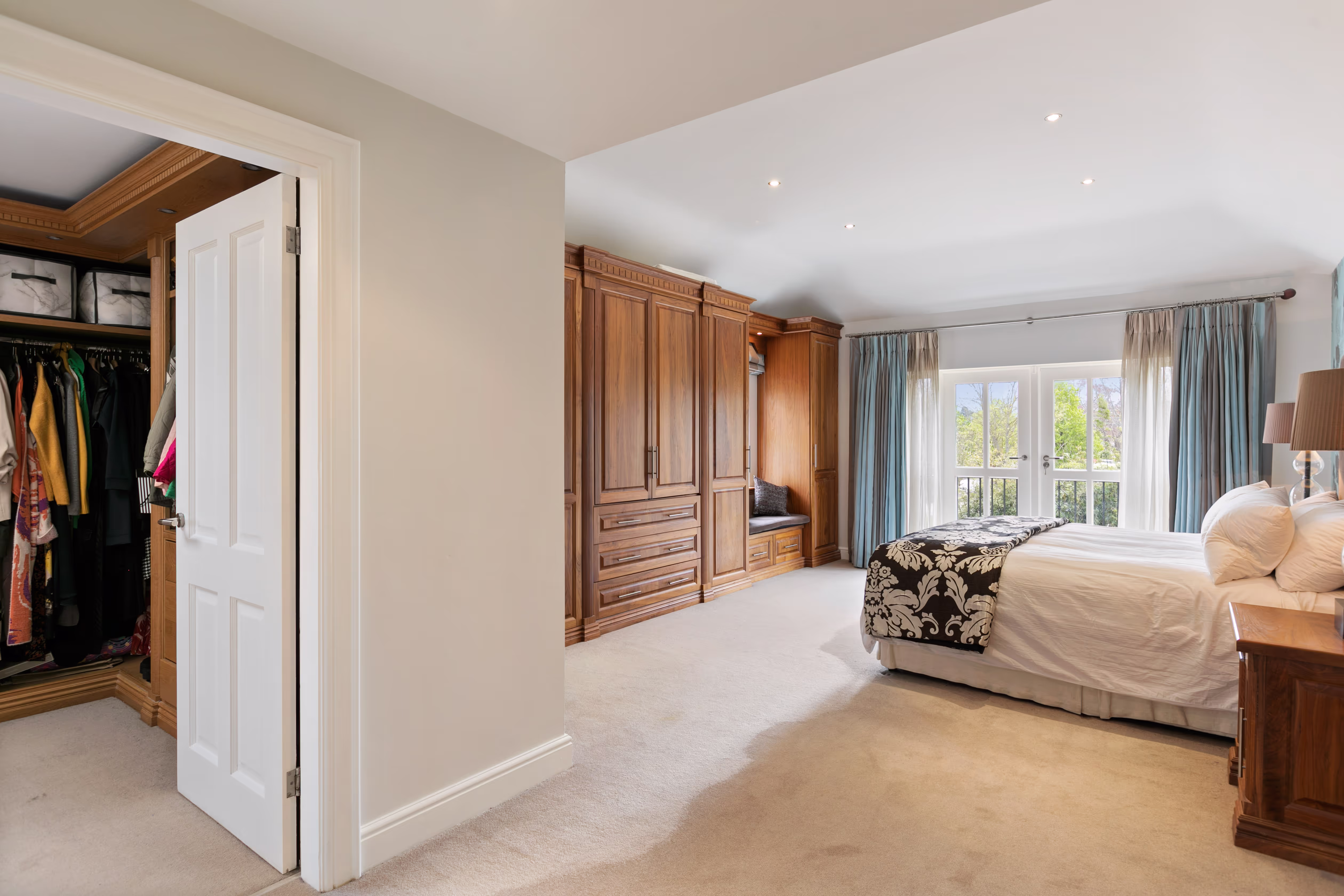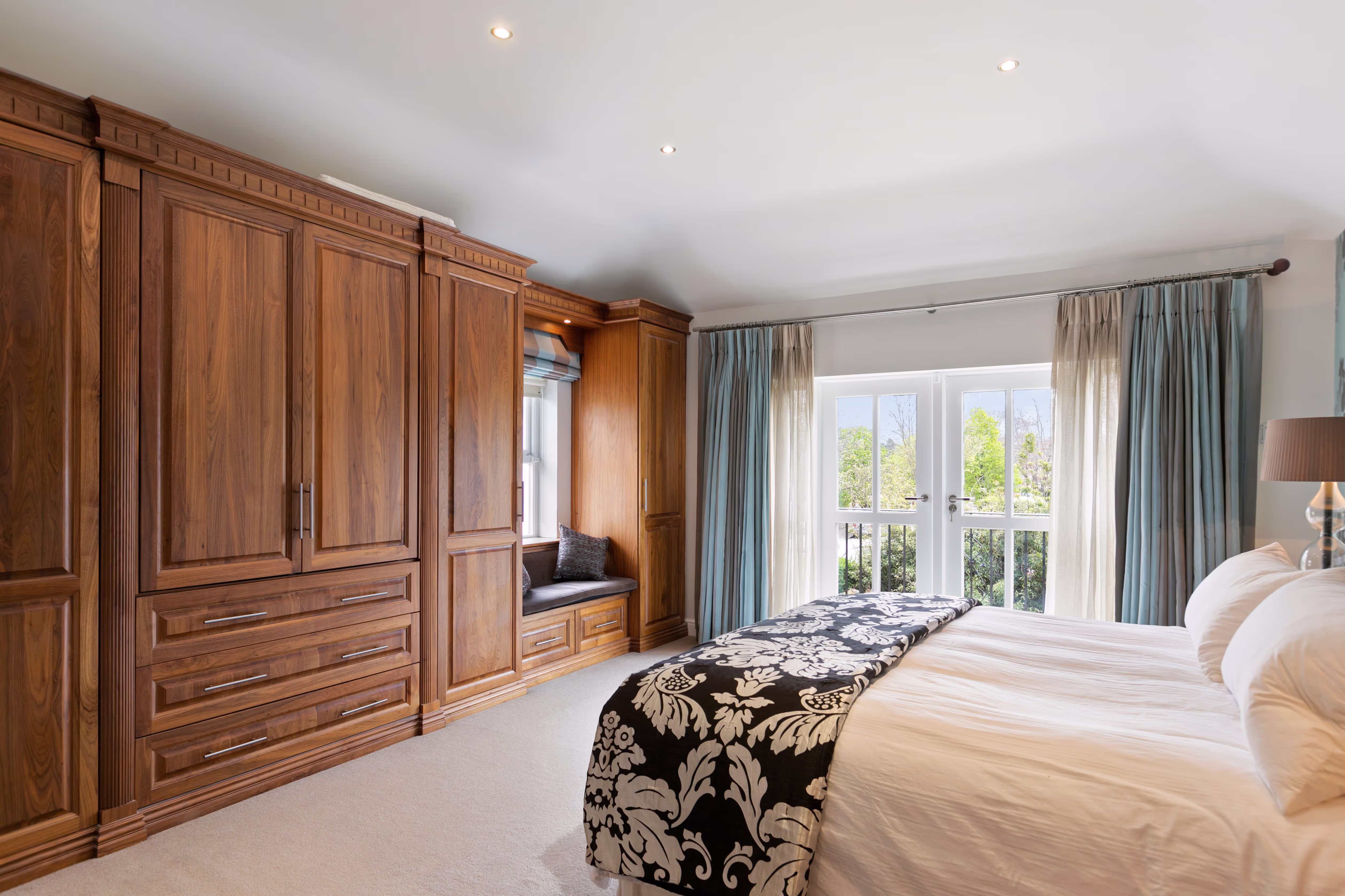 Wall of fitted solid Walnut wardrobes by Christoffs with seating area, recessed lights and balcony off.