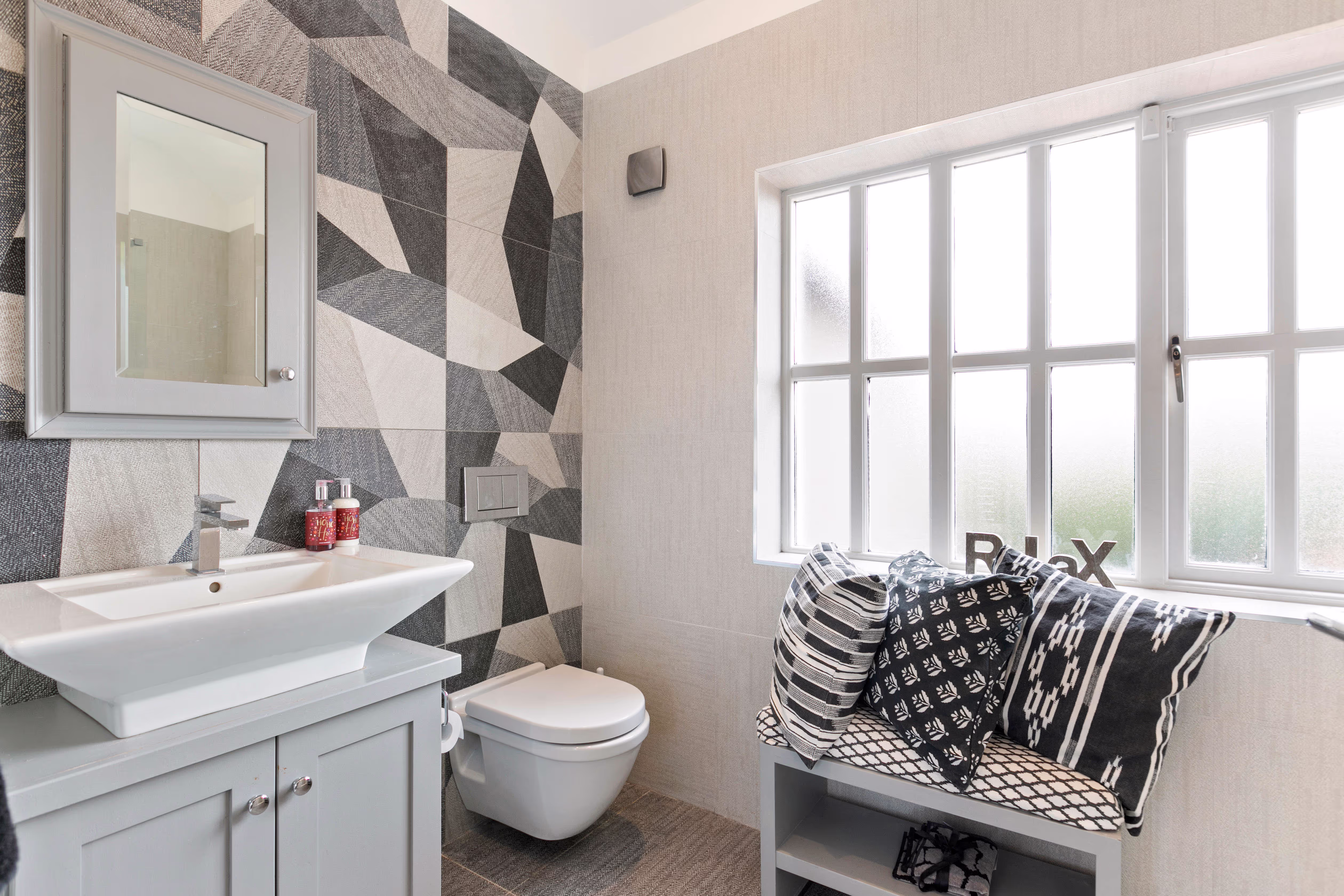 Concealed w.c , whb with shelving underneath, recessed lighted with tiled walls and Crema Marfil Marble floor