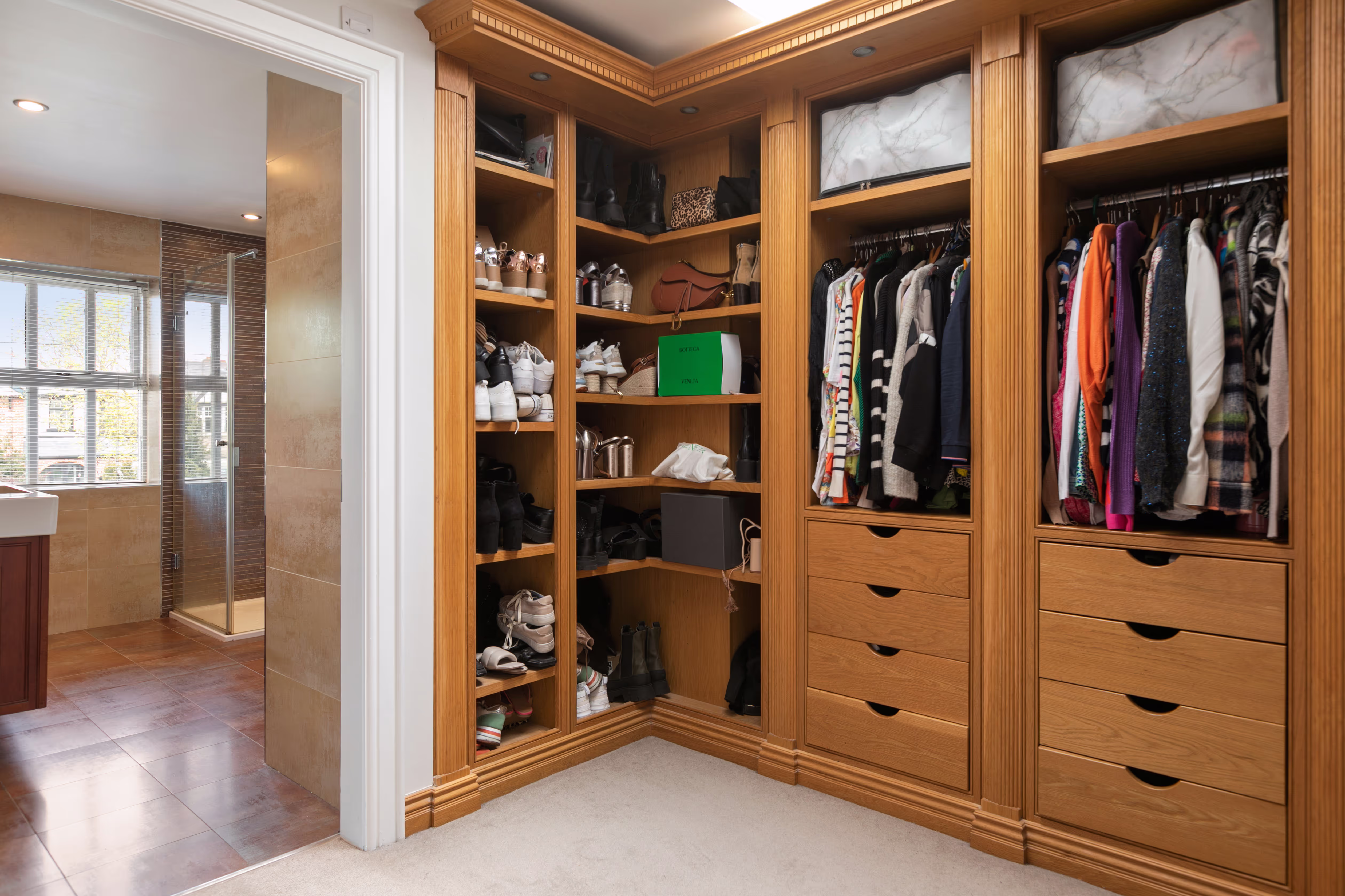 Range of solid Oak open wardrobe units by Christoffs with drawers, hanging and shelving. Vanity area with additional storage. Velux Window and recessed lights.