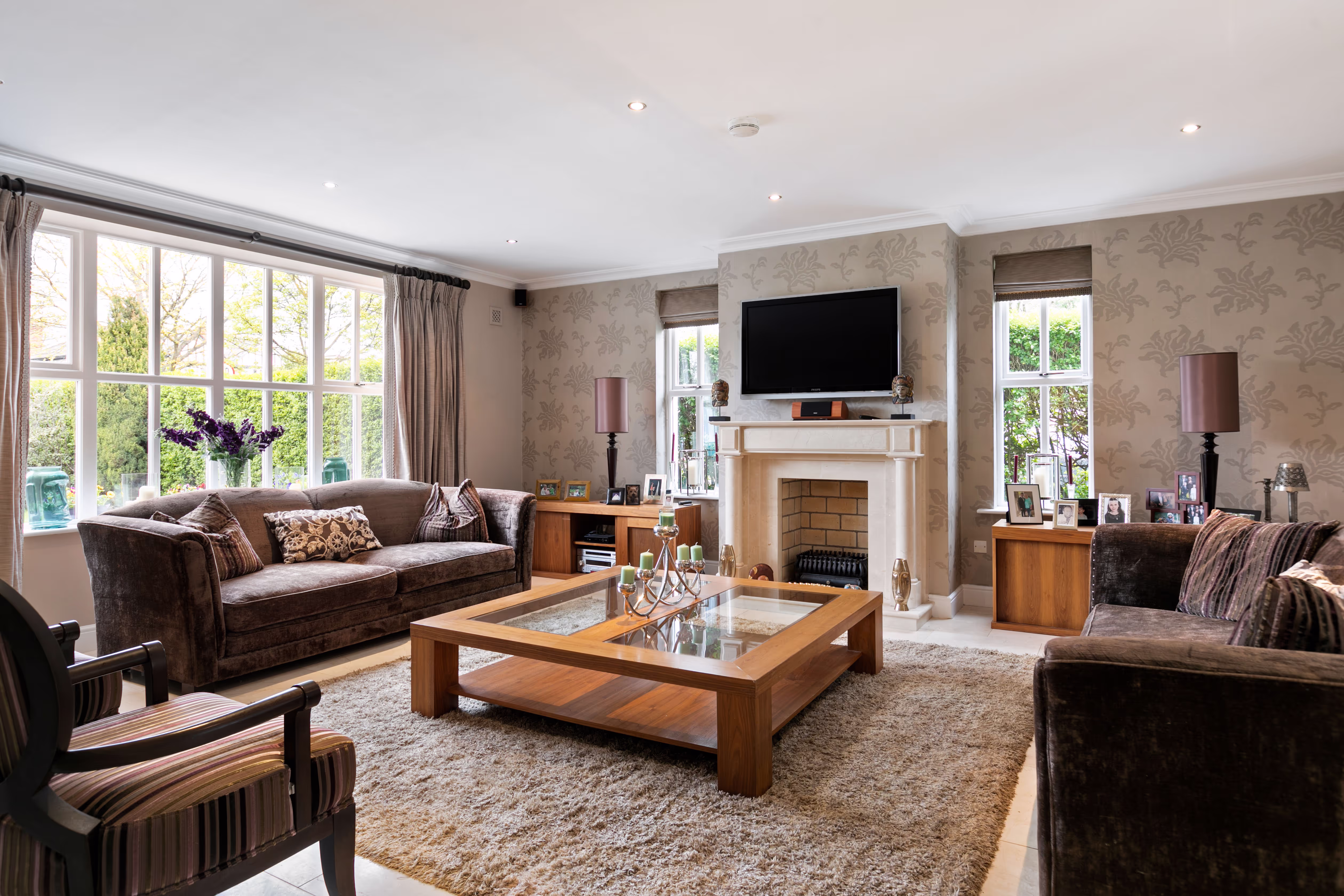 Feature marble mantlepiece with gas fire and brick chamber, ceiling coving, recessed lights, Crema Marfil Marble floor. Floor to ceiling glazed doors to dining area.