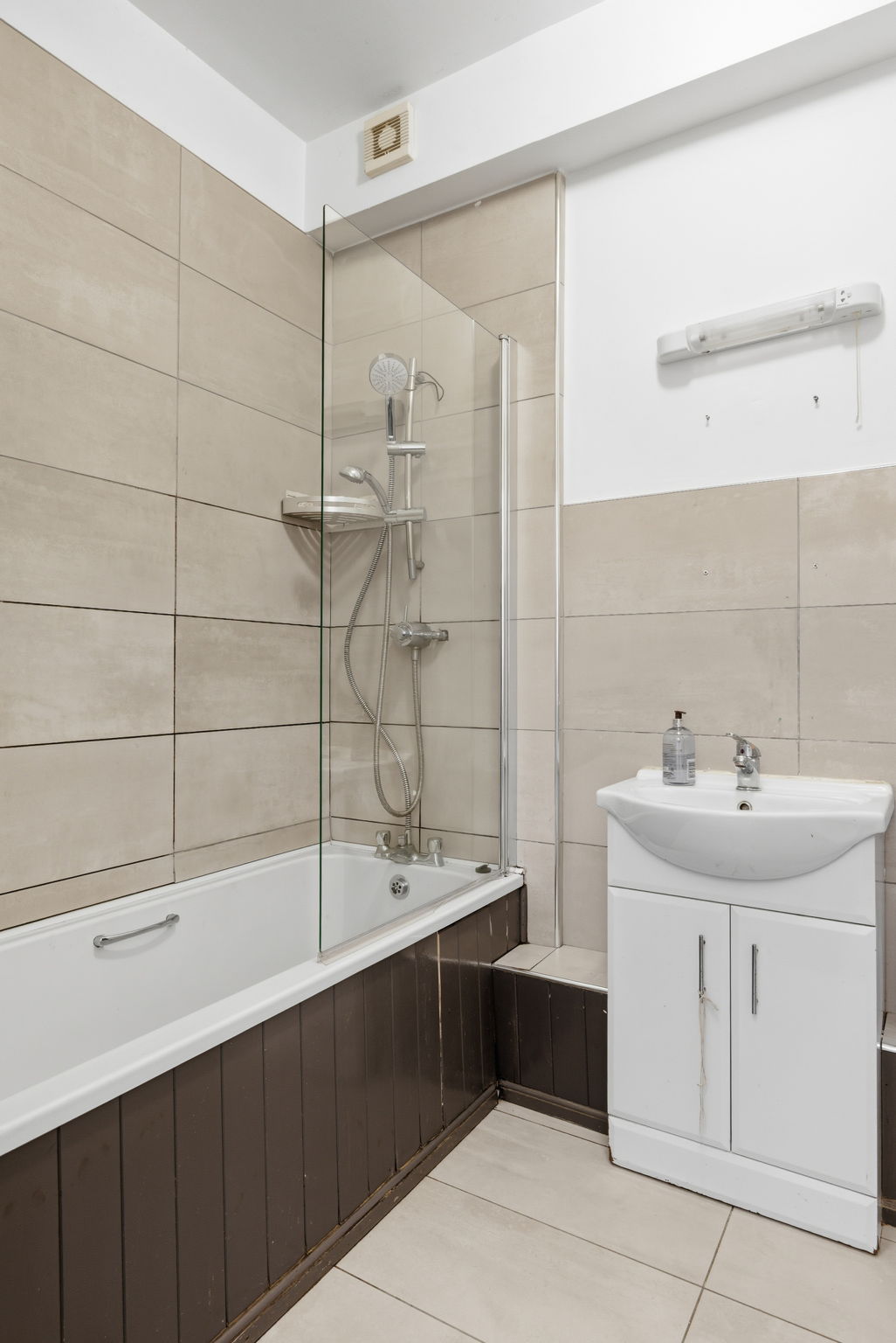 Bath, Shower with telephone shower attachment. W.C., whb,medicine cabinet, Part-tiled. Tiled floor.