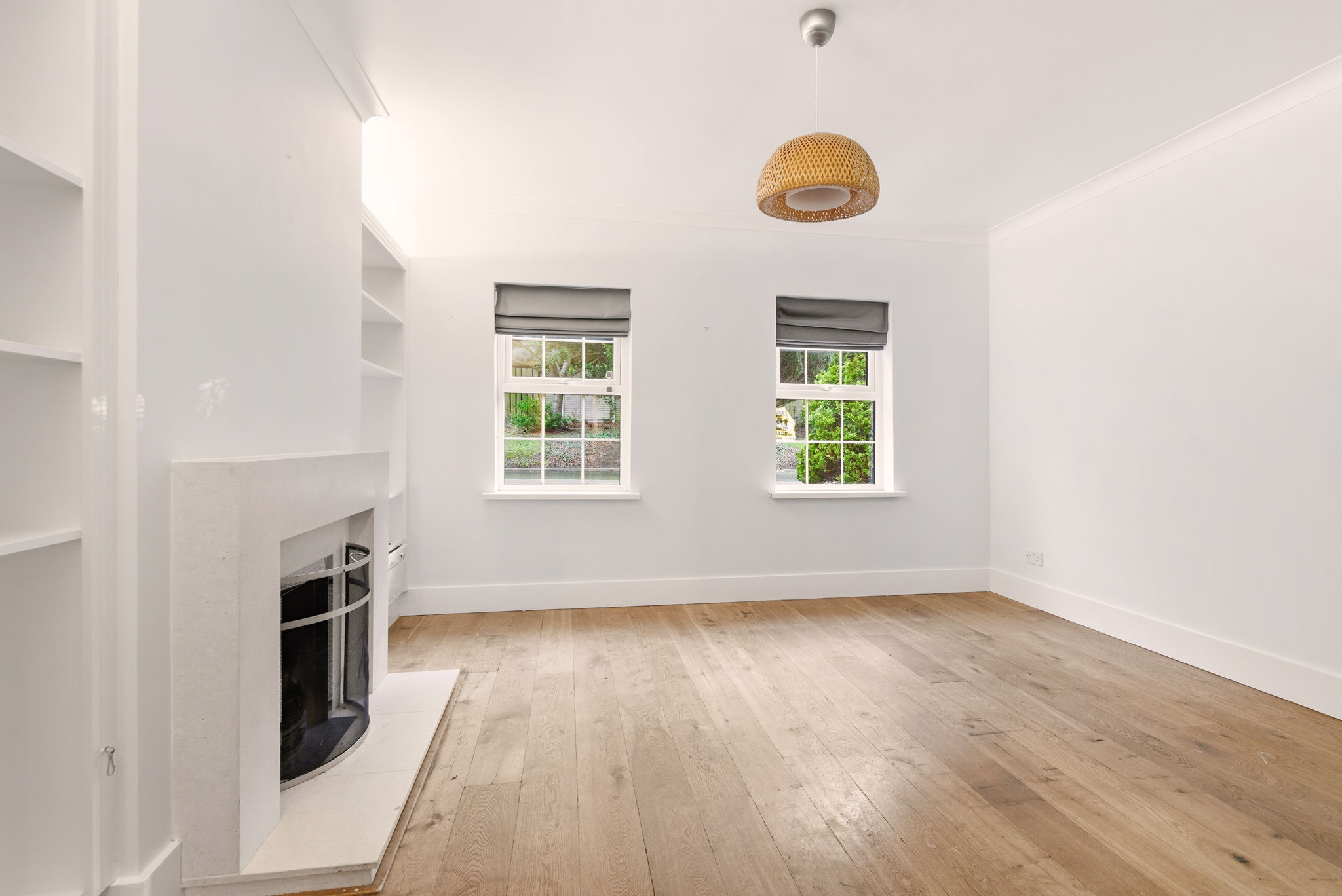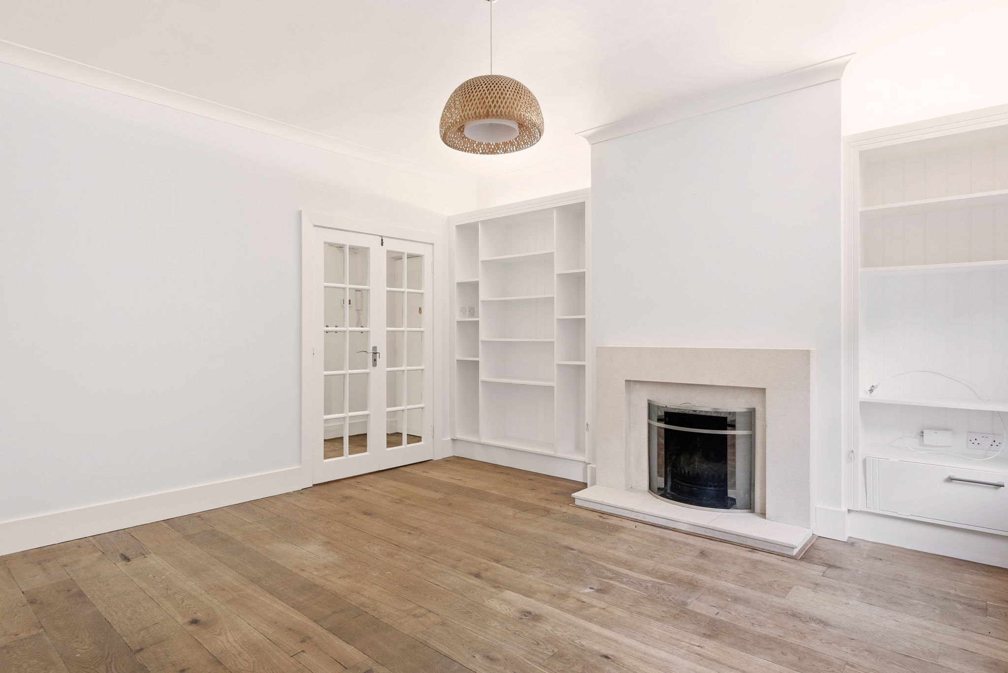Mantlepiece, Open fire. Fitted shelving. Timber flooring.