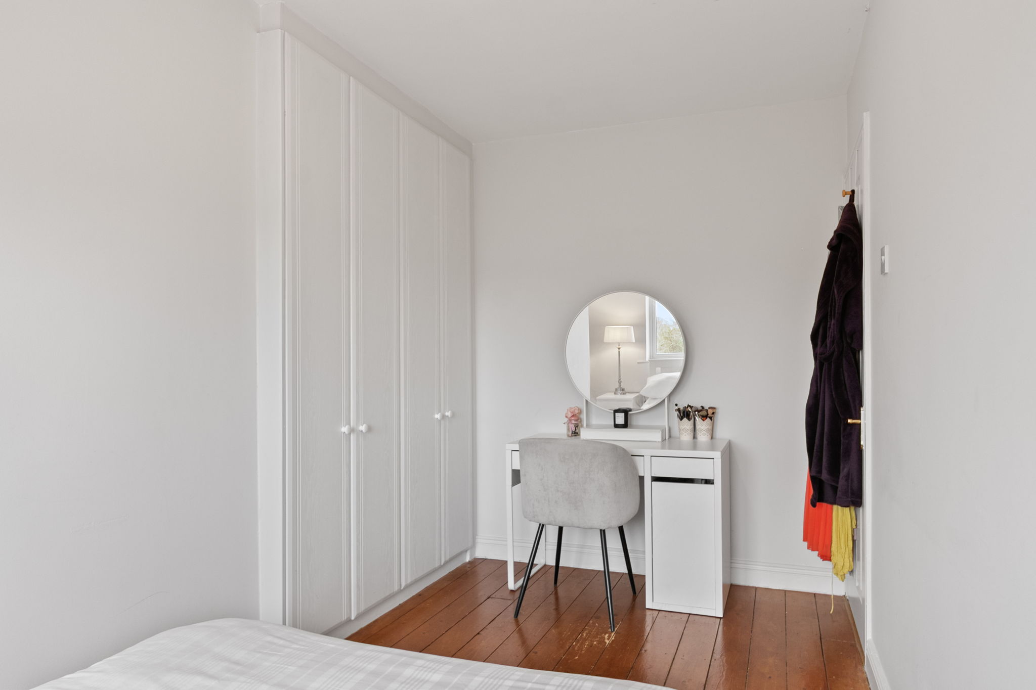 Solid wood floor and built in wardrobe.