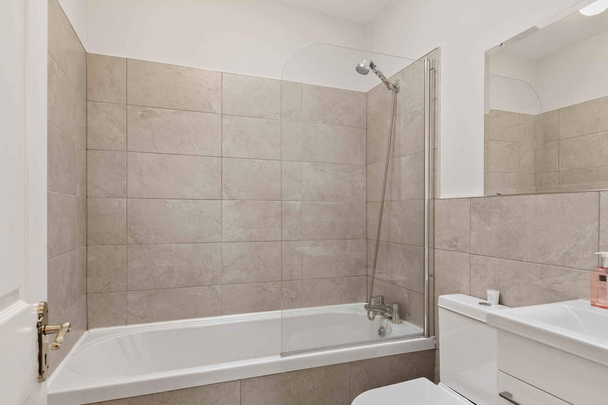 Bath with shower attachment, w.c, vanity whb, mirror and towel radiator.