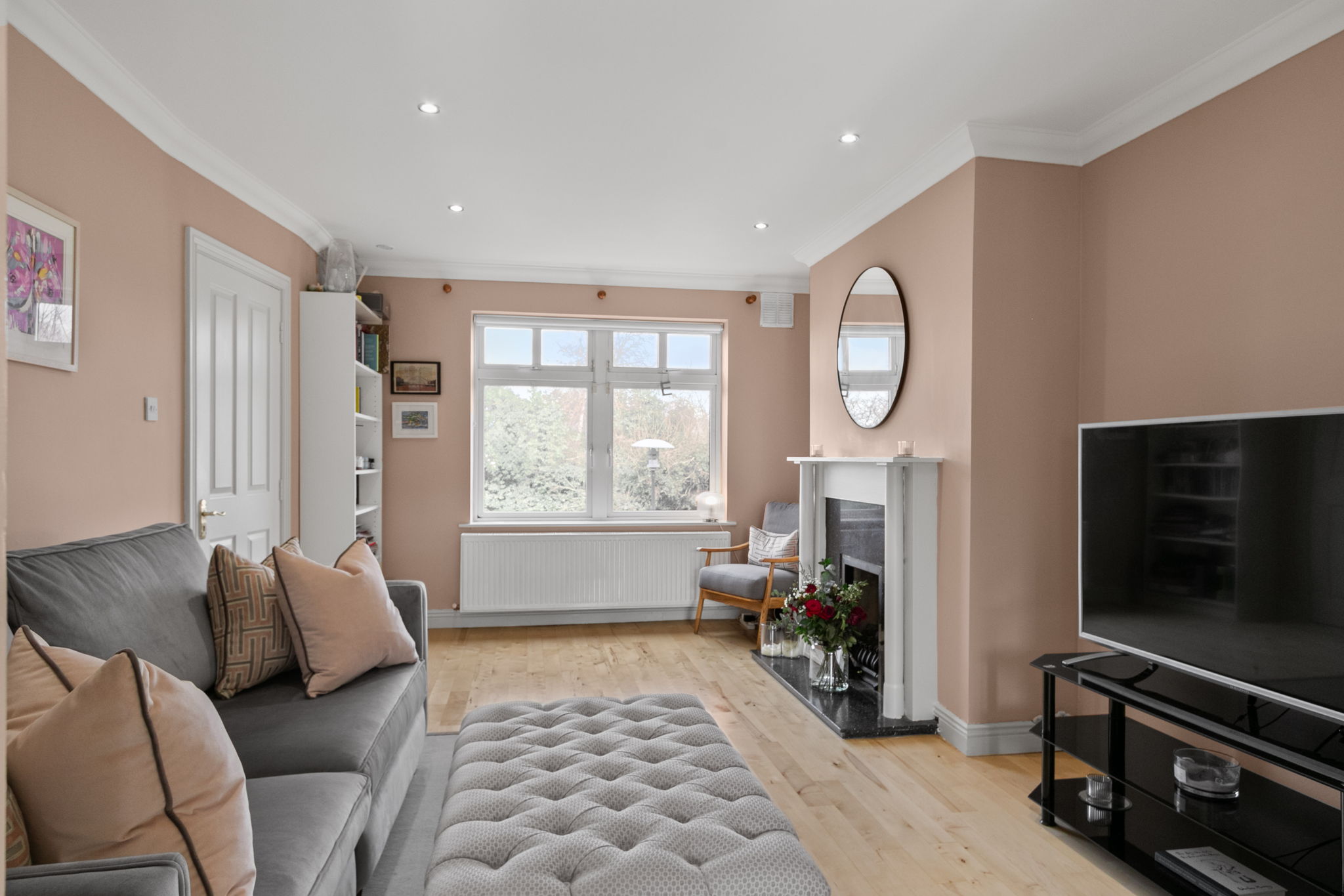 Solid wood flooring, recessed lights and double doors to terrace.