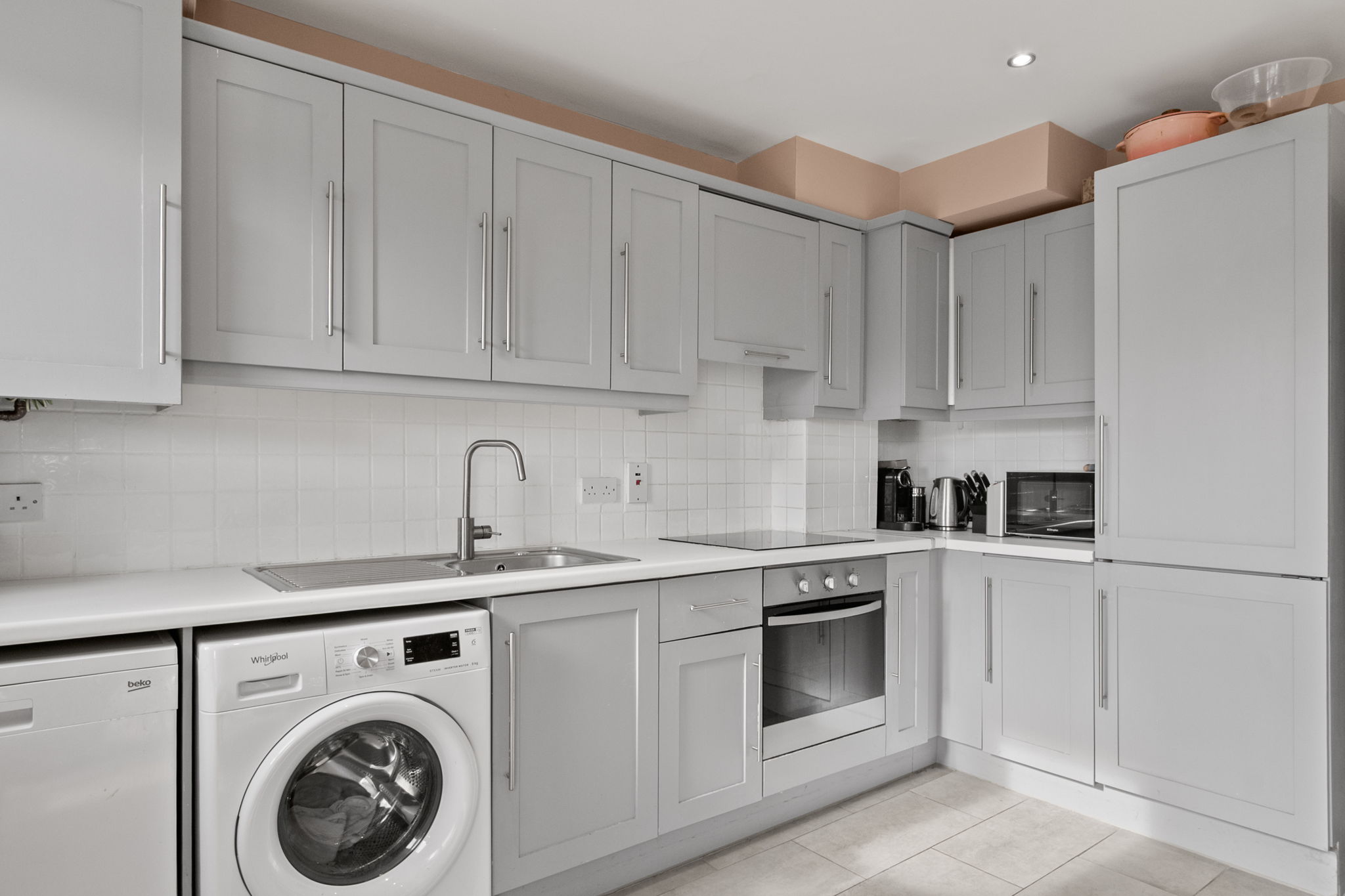 Extensive range of overhead and undercounter shaker style fitted units, plumbed for washing machine and dishwasher. Sink unit, hob and extractor fan. Subway tiled splashback and tiled floor.