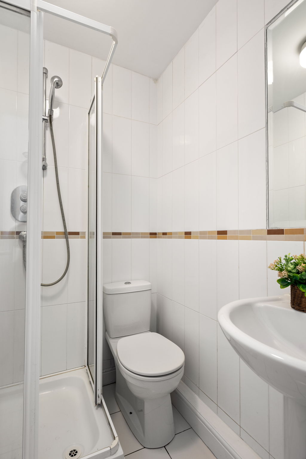 Both bedrooms are generously proportioned doubles, each enjoying excellent natural light and fitted wardrobes. The primary bedroom benefits from a sleek ensuite complete with shower, wash hand basin and WC. A contemporary family bathroom with full tiling, bath and shower attachment, washhand basin, WC, and wall-mounted towel radiator completes the accommodation.