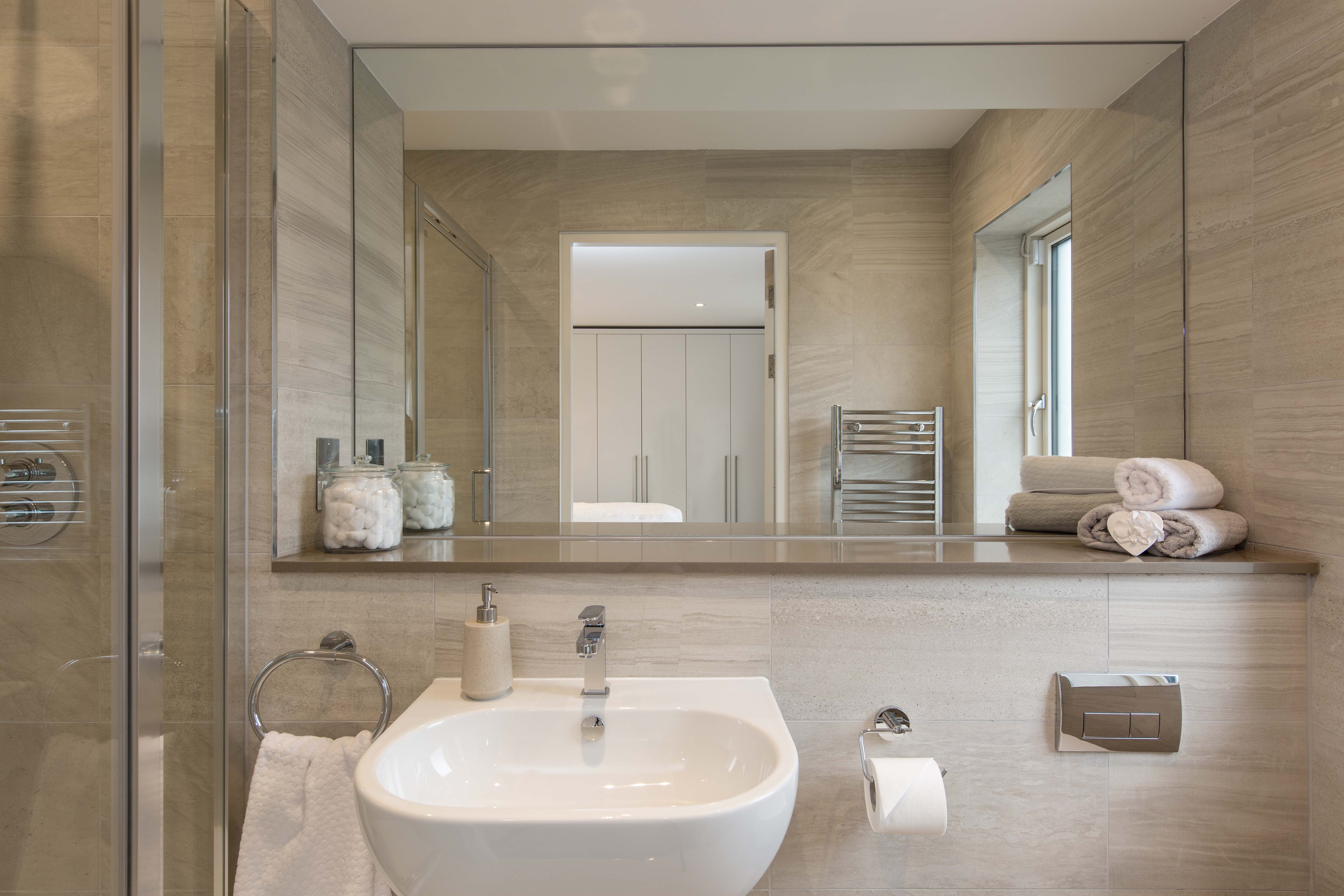 This fully tiled bathroom offers an escape from the stresses of the world, with a double-size shower tray equipped with a choice of rainfall shower head or adjustable shower head and a heated towel rail for your comfort.