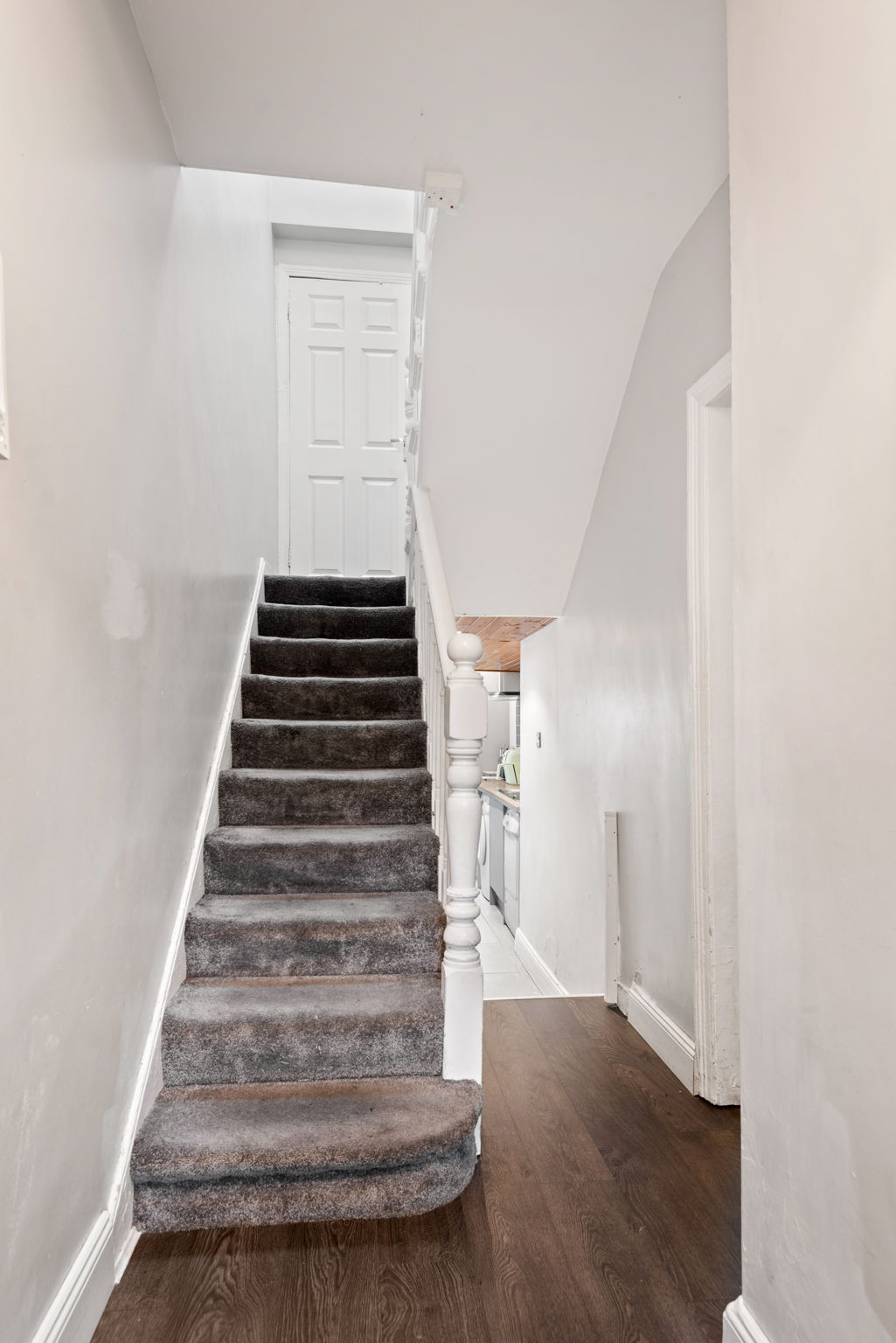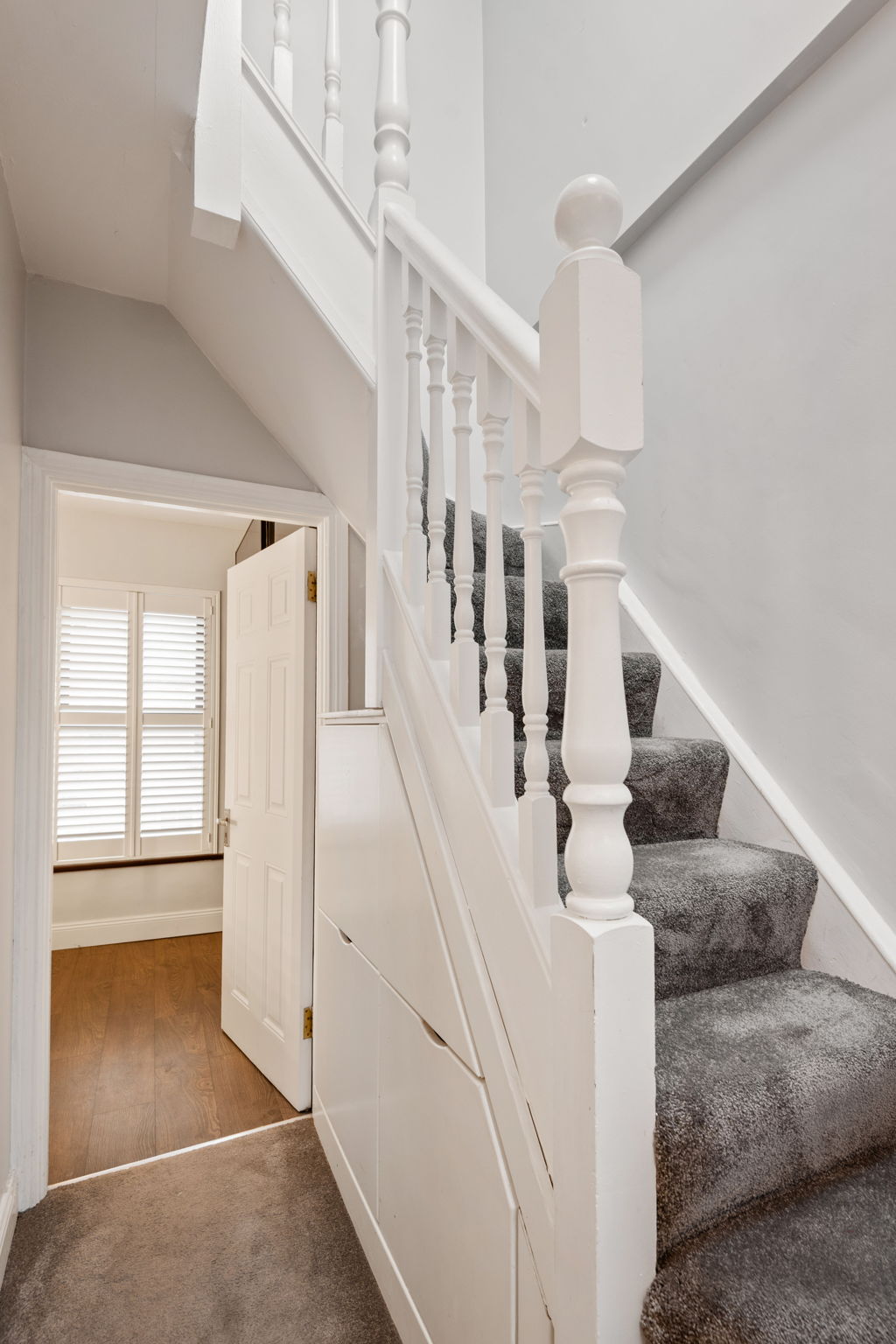 Laminate floor, understairs storage.