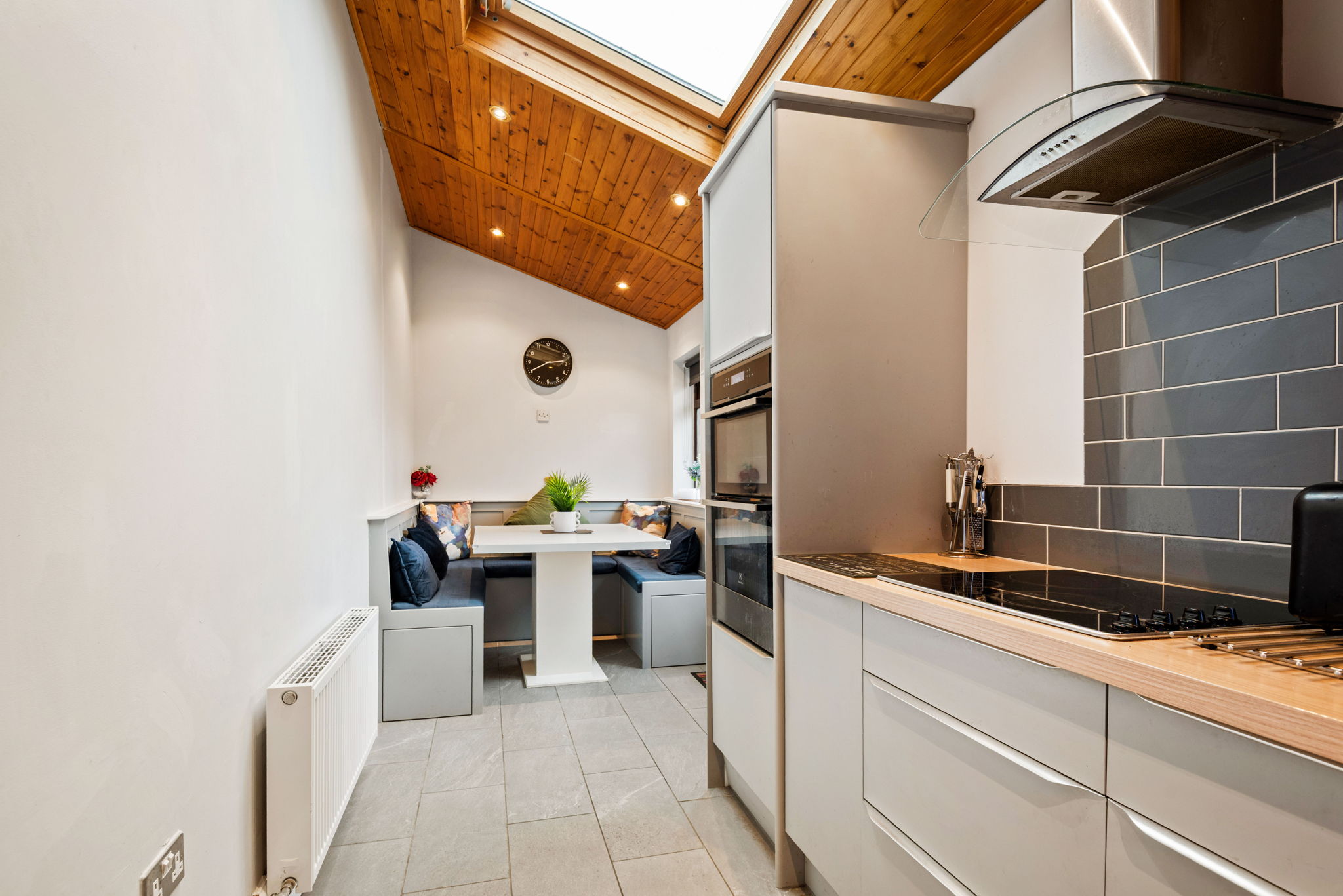 Extensive range of modern kitchen units, hob, extractor, sink unit, plumbed for washing machine and dishwasher. Tiled splashback and floor. Panelled ceiling, built in dining area, velux rooflight and door to garden.