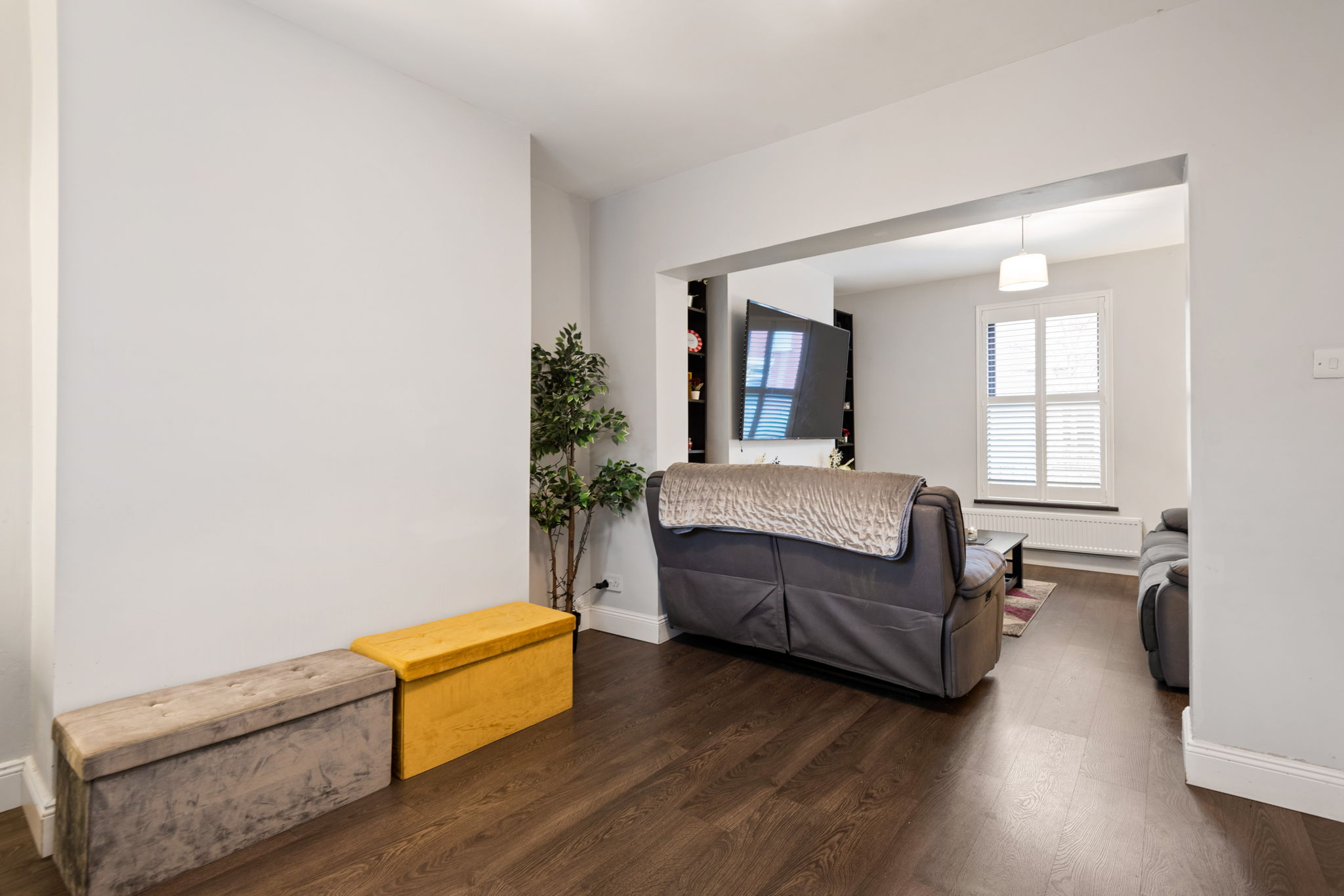 The accommodation briefly comprises of an entrance hall with understairs storage. There are two interconnecting reception rooms the living to the front with laminate floors and window shutters. To the rear is the dining/lounge with laminate flooring and window shutters.