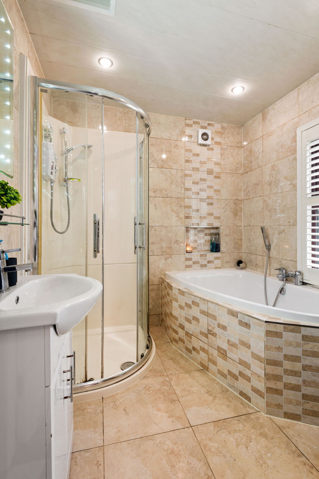 Fully tiled with luxurious corner bath with shower attachment, separate electric shower, w.c, vanity whb, backlit mirror and towel radiator.