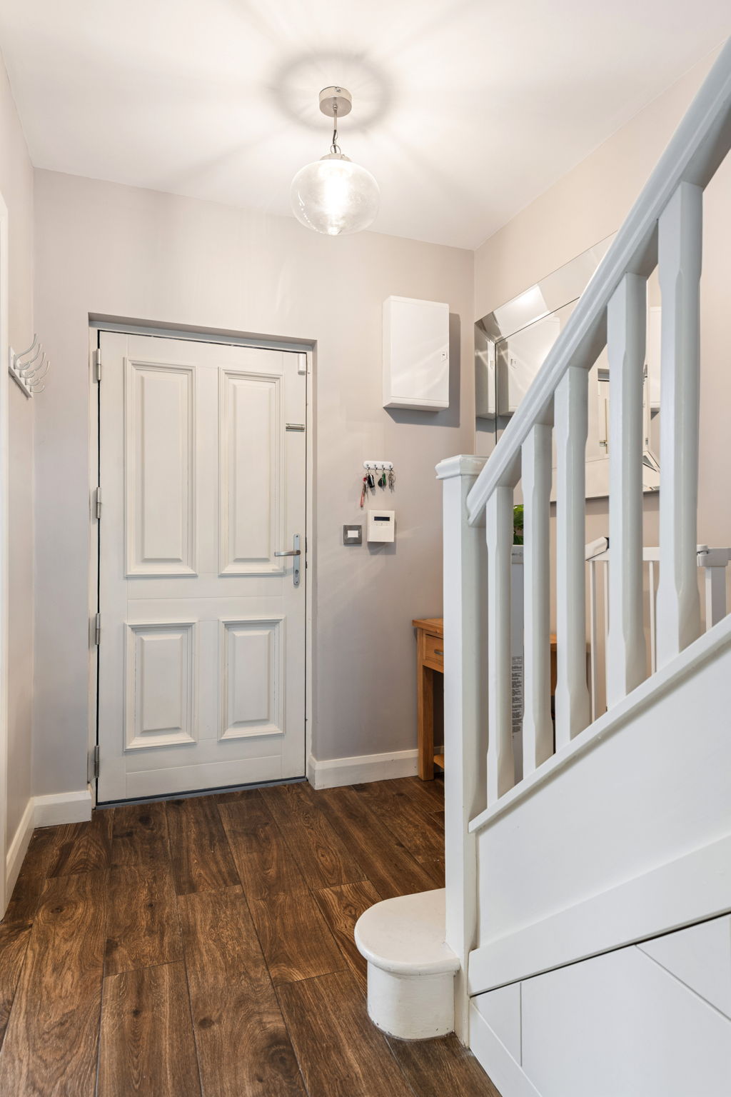 Entrance Hall: Tiled flooring, Understair storage, w.c., whb, with medicine cupboard, part tiled.