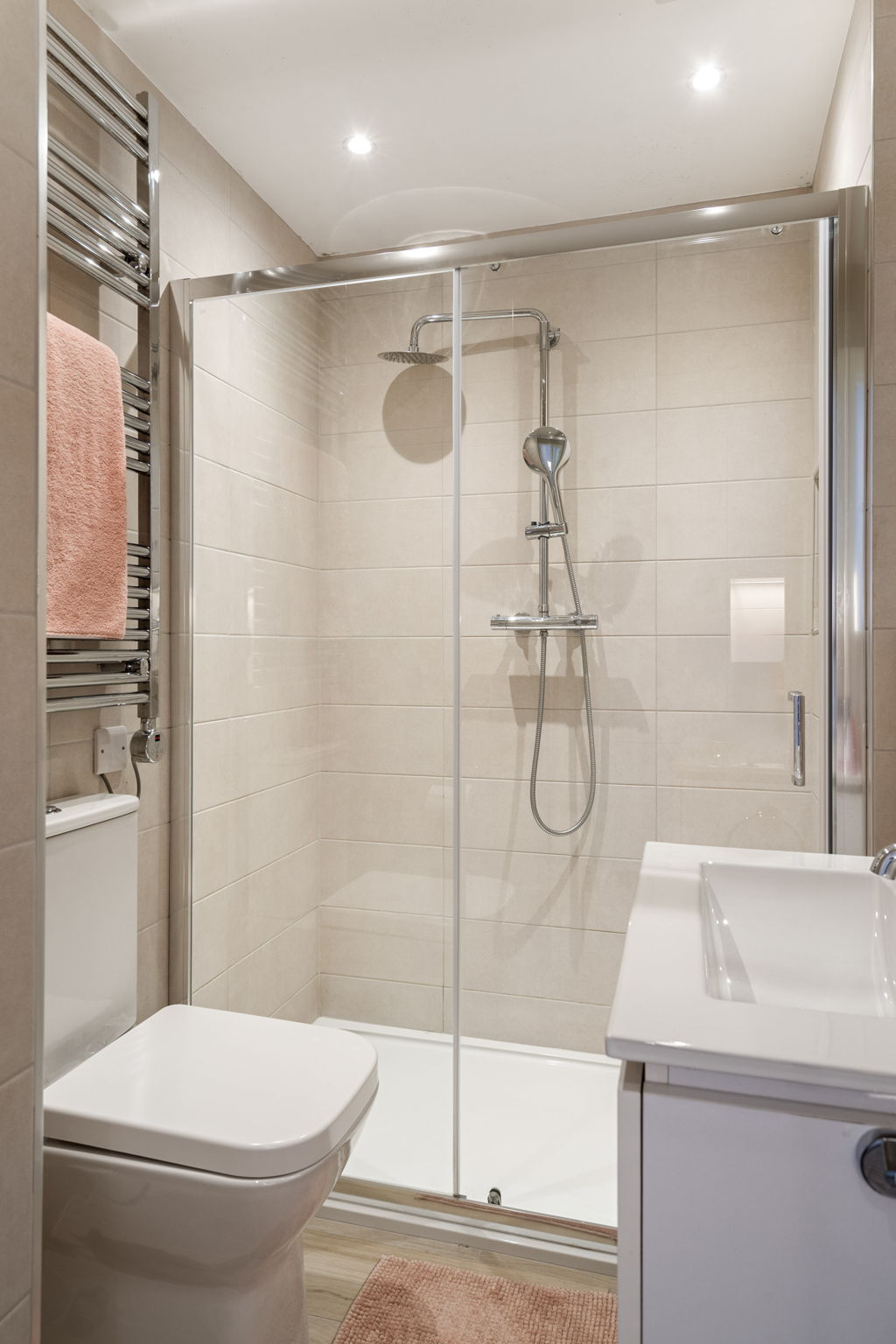 Features include a large dual-head power shower, electric towel rail, ventilation fan and a demisting illuminated mirror