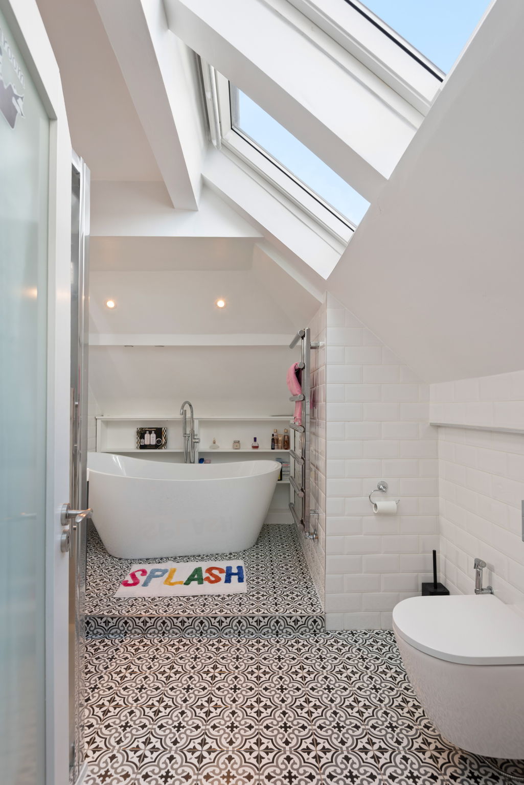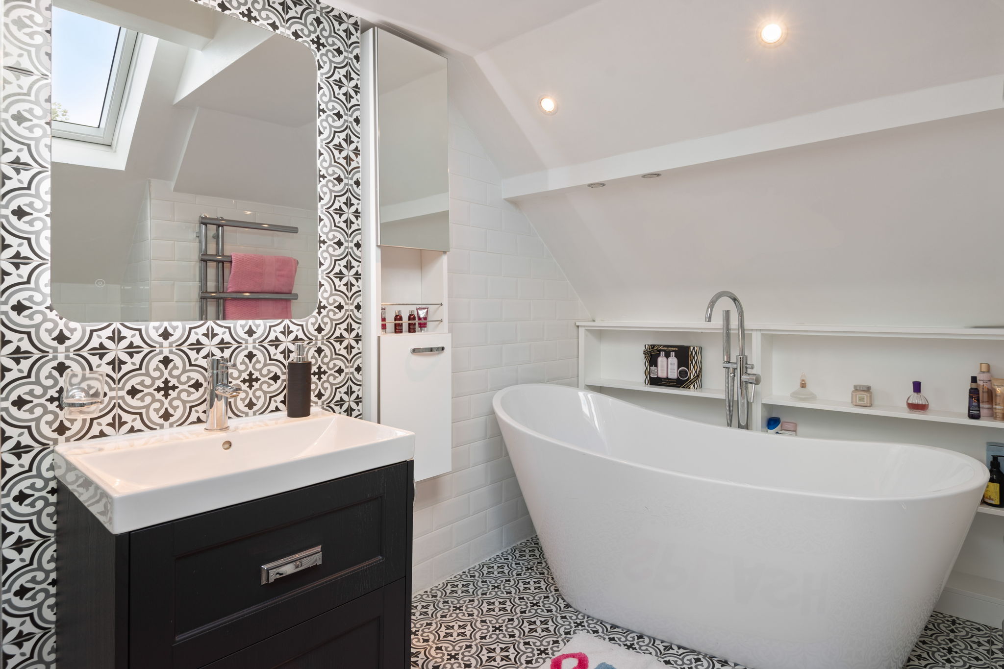 Fully tiled with stand alone bath, separate shower, w.c, vanity whb with drawers, medicine cabinet, backlight mirror, recessed lights and velux rooflight.