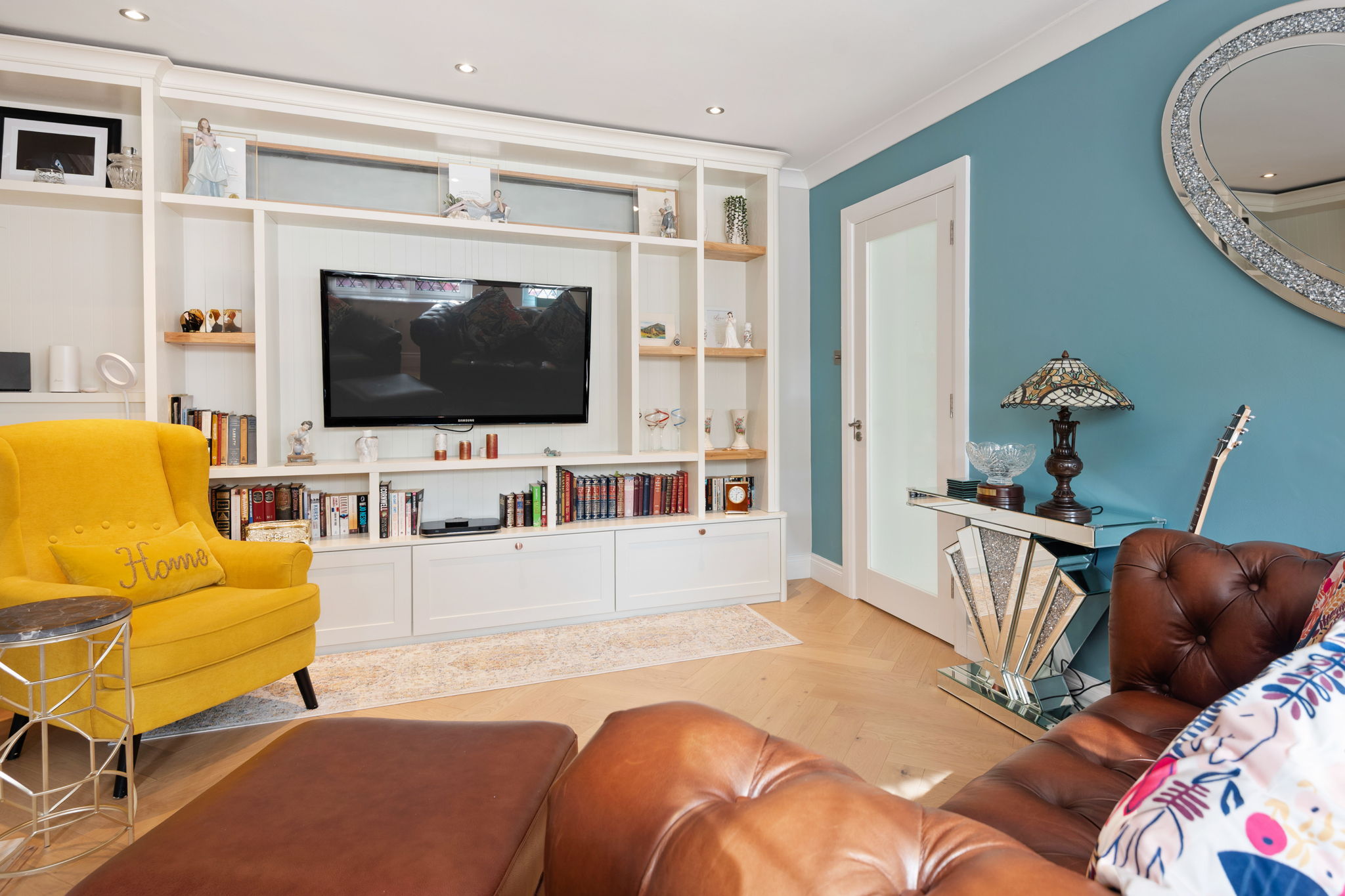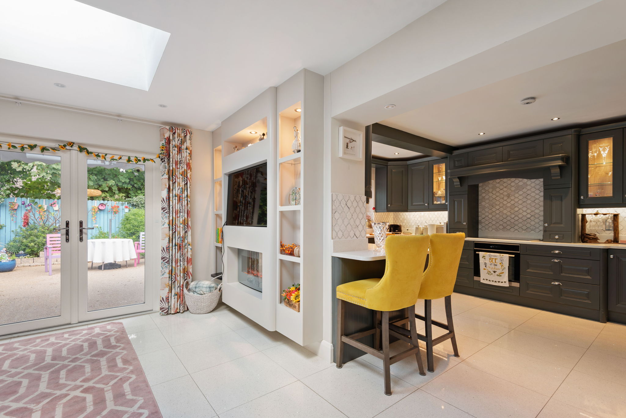 Built in media wall with electric fire and shelving, tiled floor, double doors to rear garden, two velux rooflights, recessed lights and opening to the