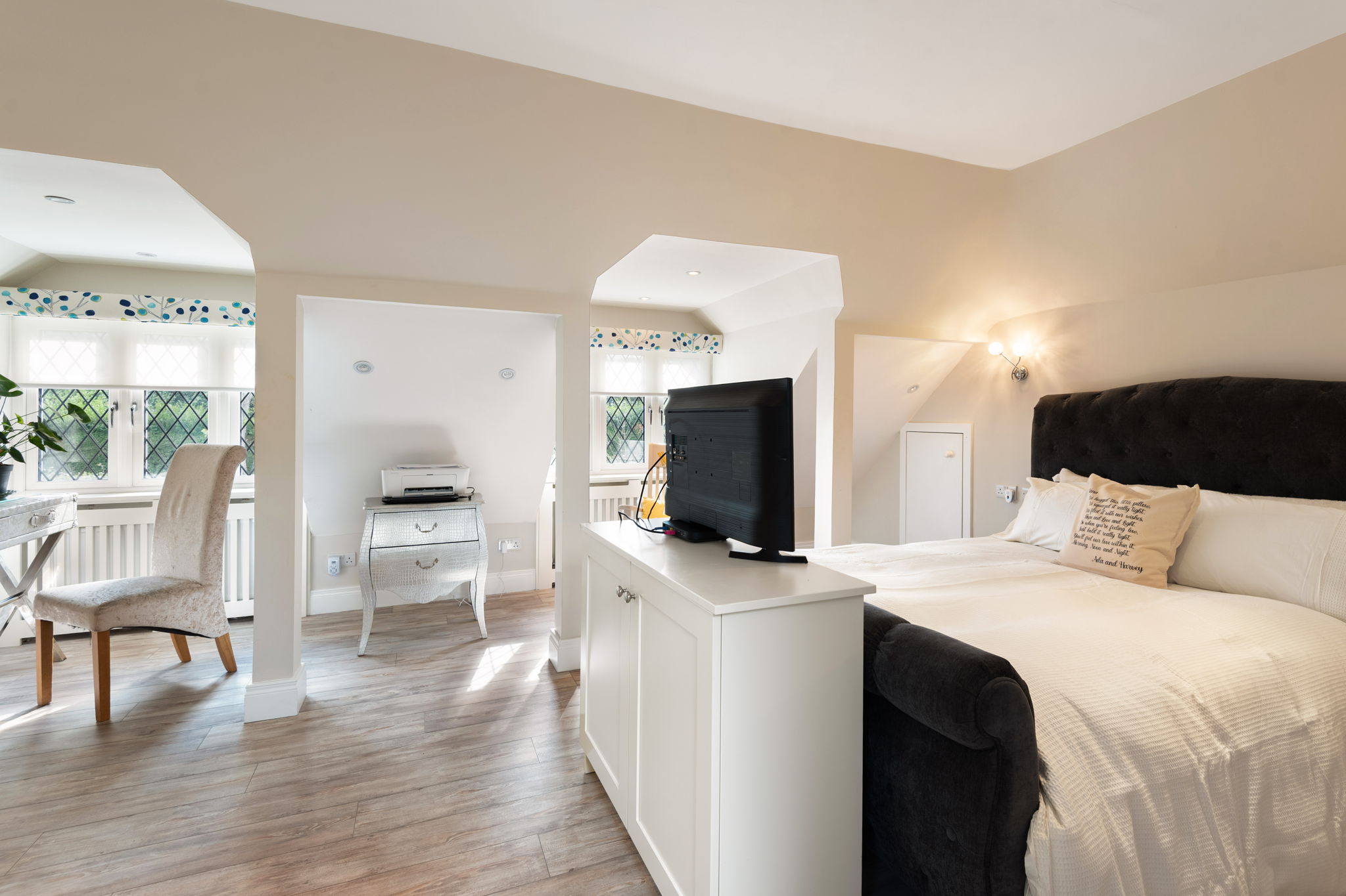 Upstairs is the second bedroom which is very generous in its size with built in wardrobes, eaves storage and room for vanity tables. Additionally, there is a second bathroom at first floor level with stand alone bath, shower, w.c, whb and fully tiled walls and floor.