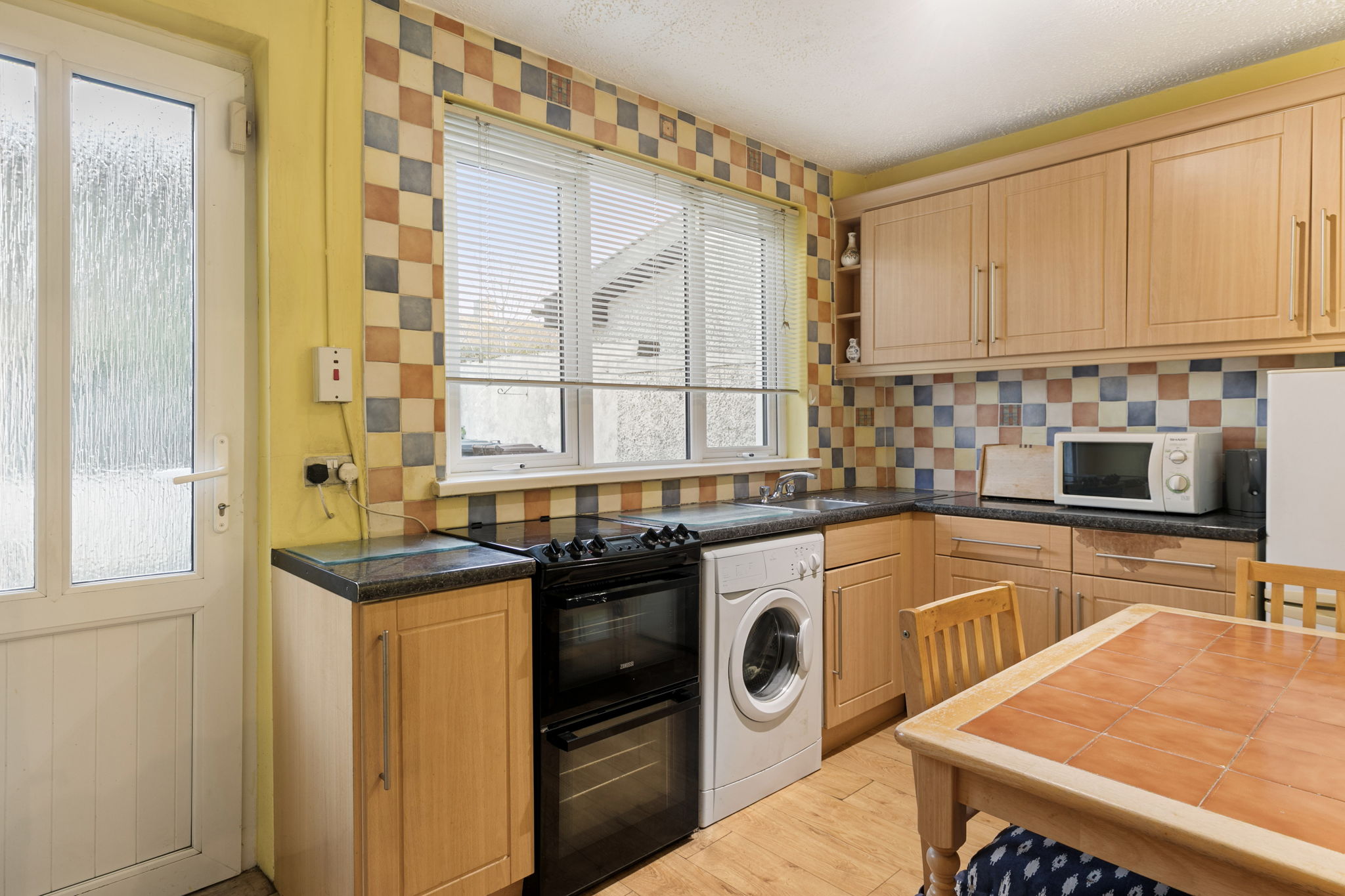 Range of units, cabinets, sink, tiledbacksplash