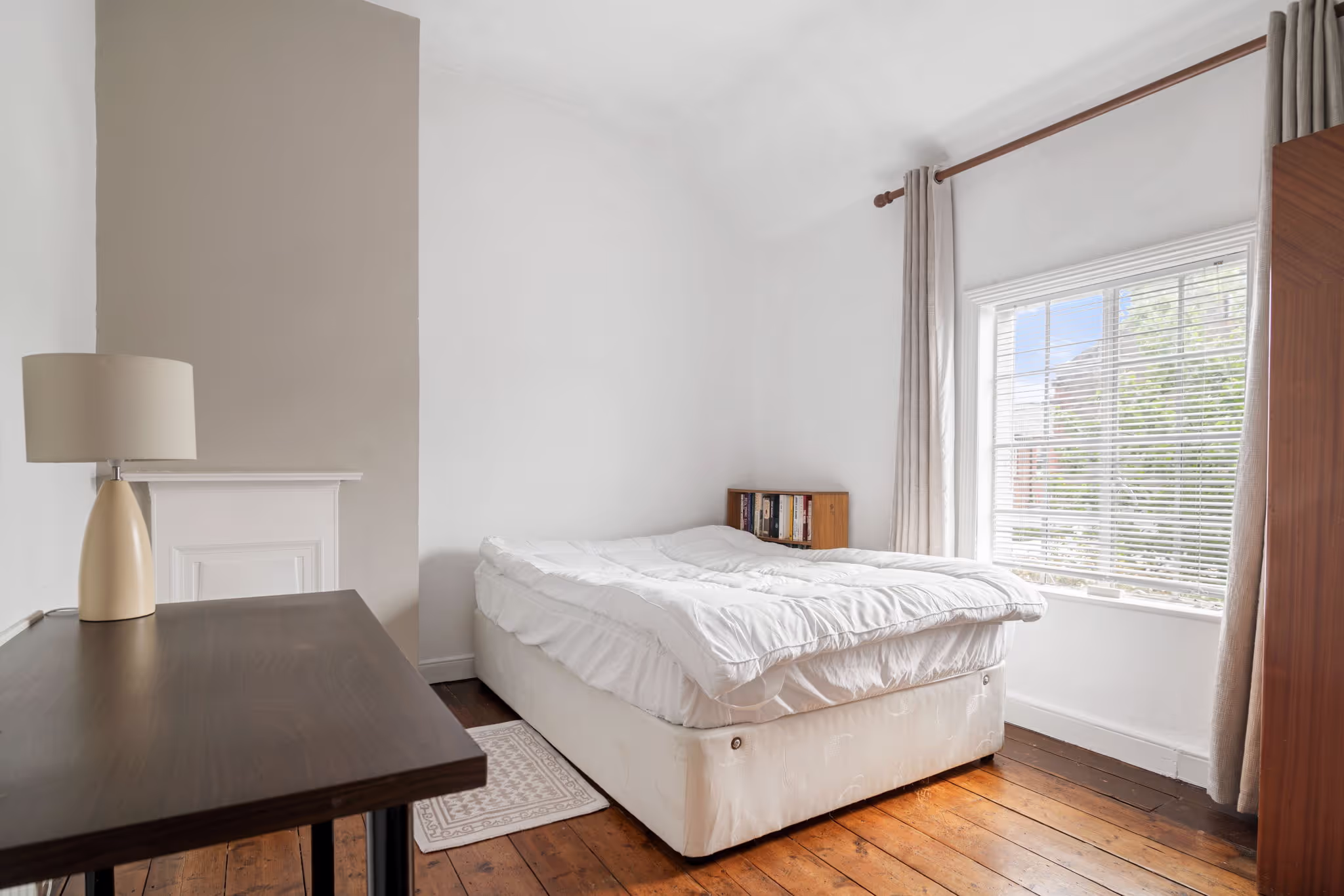 Solid wood pine floors, box bay window, period fireplace with tiled inset and hearth, brass hood and oak mantlepiece.