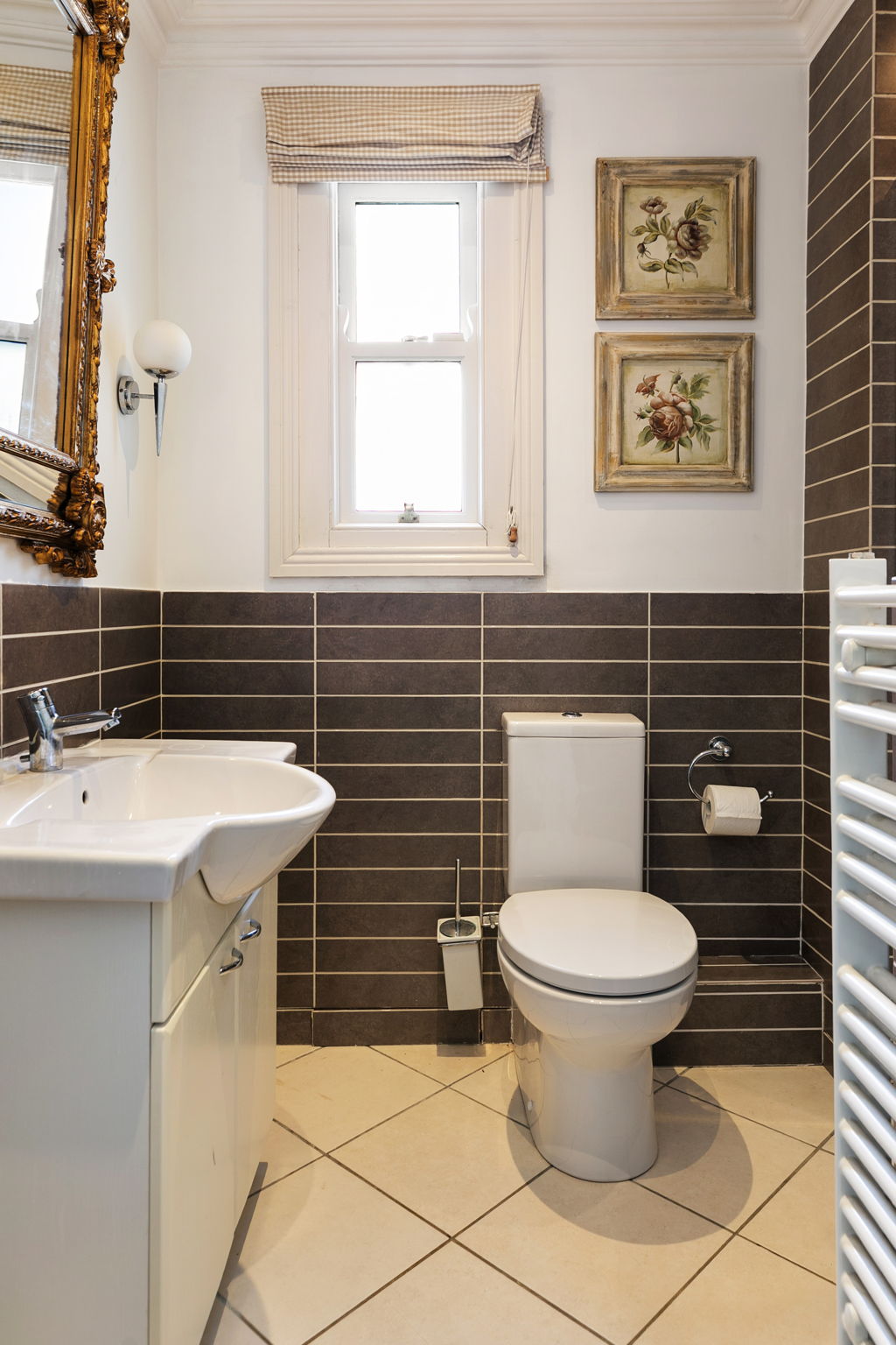Shower, w.c, whb, marble mantlepiece, ceiling coving, centre rose, towel radiator, part tiled walls and tiled floor.
