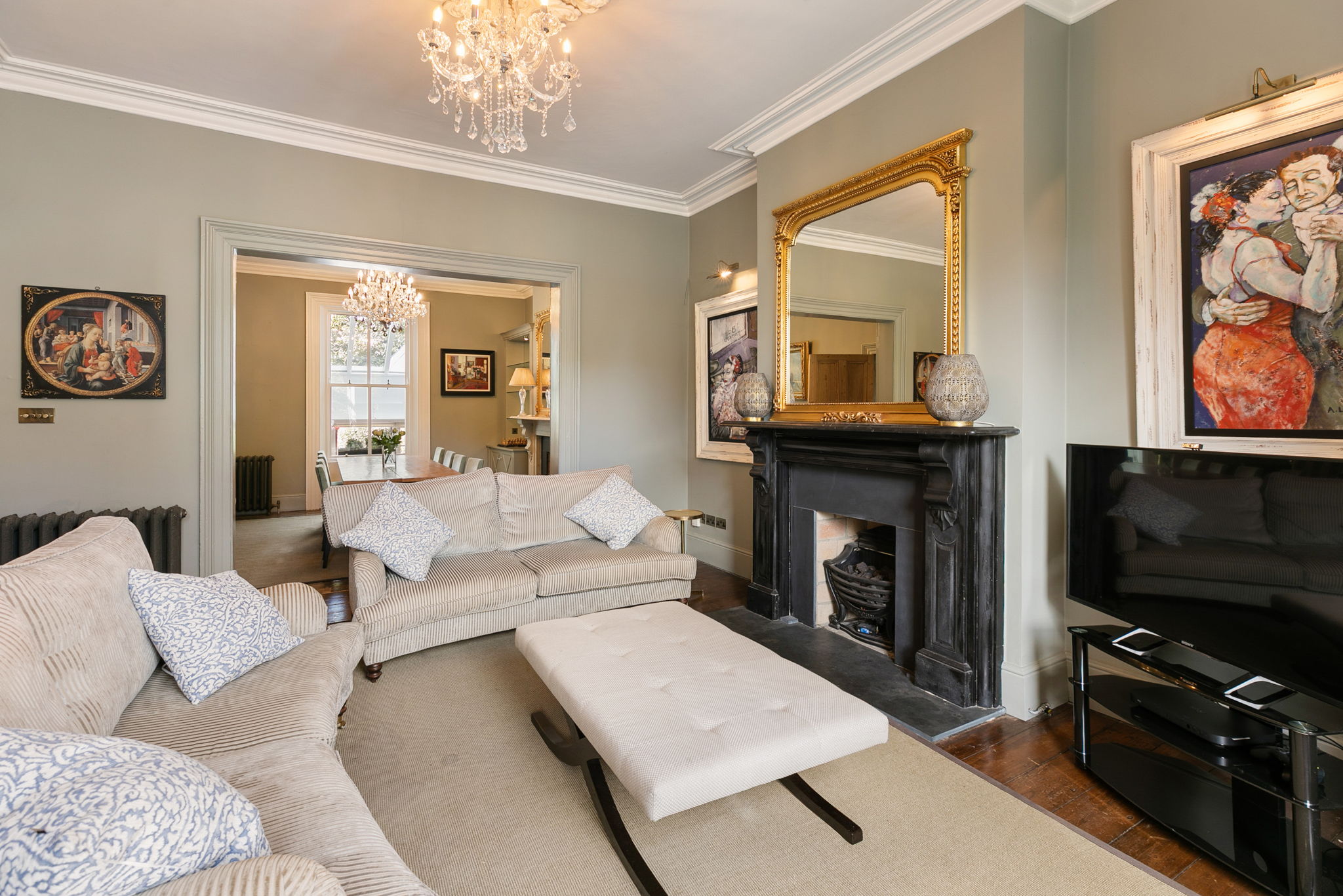 Marble mantlepiece with slate inset and hearth, ceiling cornice, centre rose, timber floor, bay window and opening to
