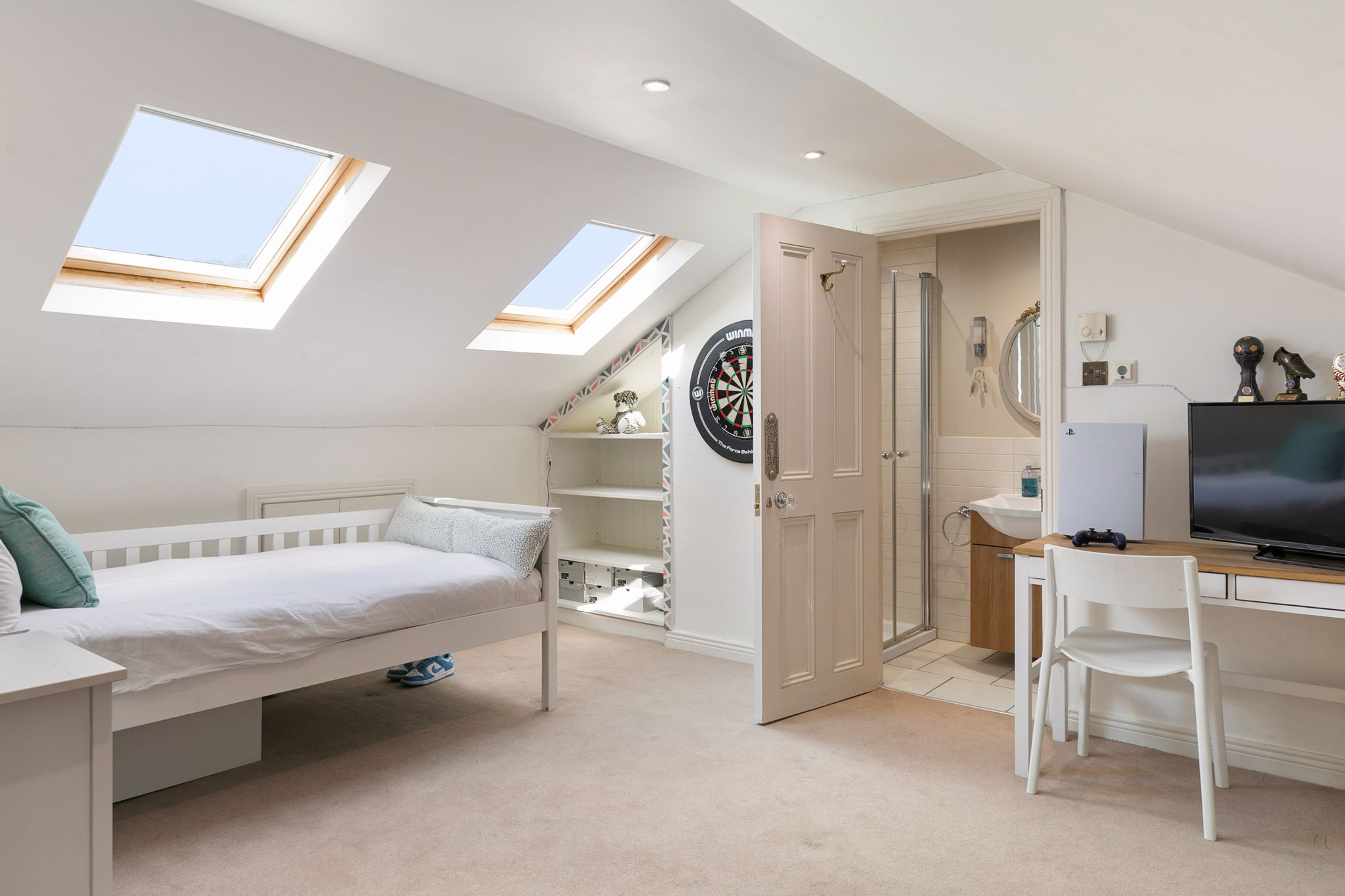 Fitted wardrobe with eaves storage, two velux windows.