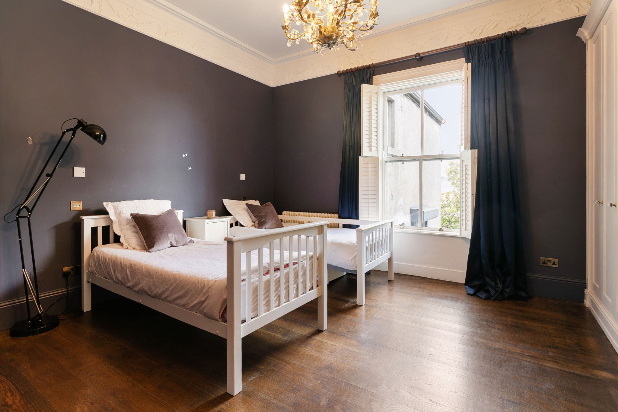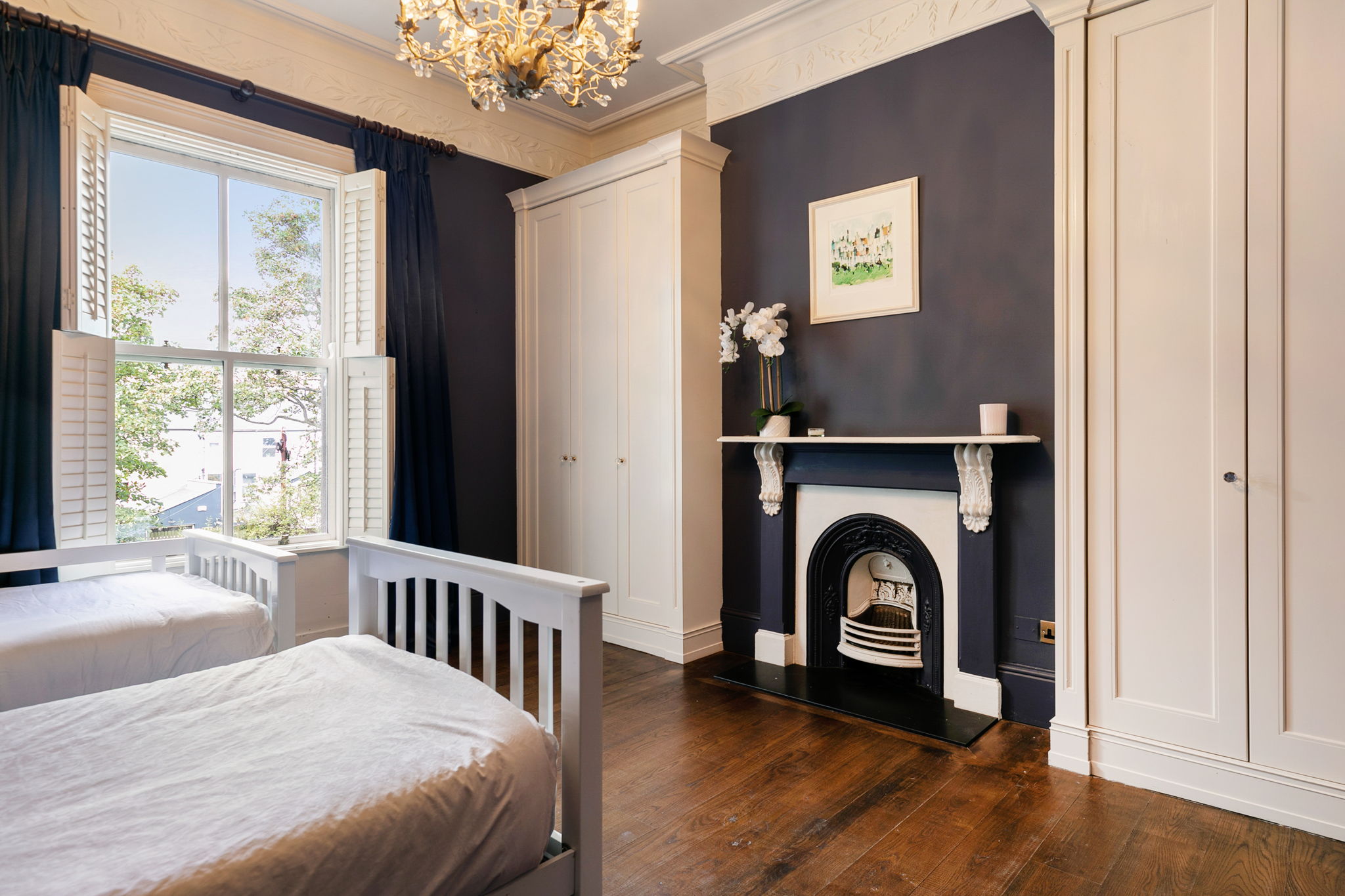 Ceiling cornice and centre rose, wall to wall fitted wardrobe and two windows overlooking Brighton Square.