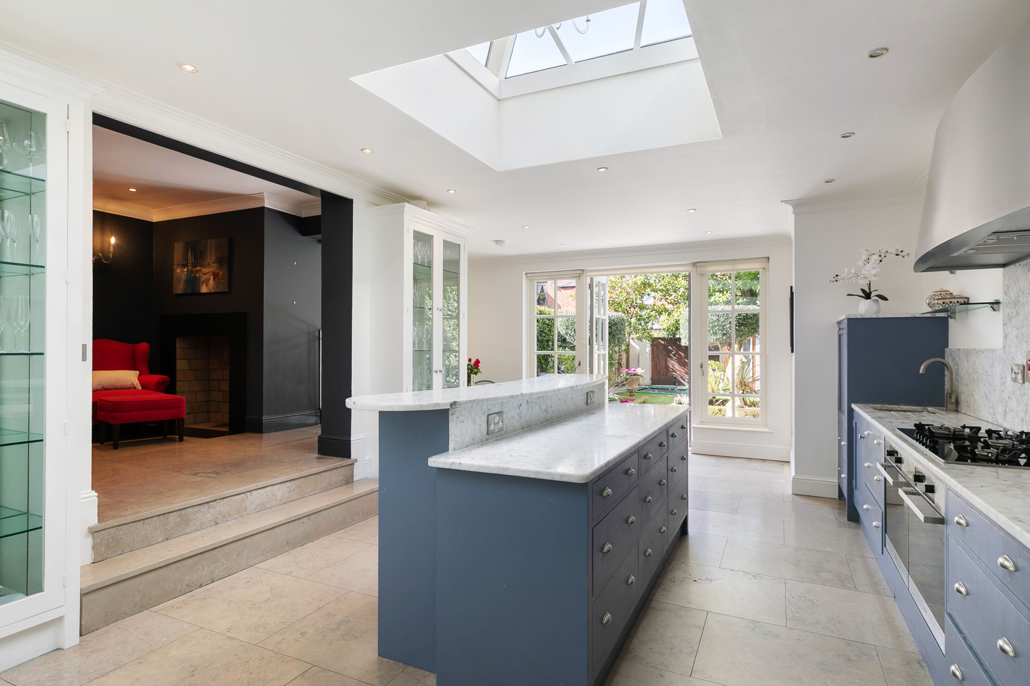 Extensive range of wooden kitchen units with marble worktop and backsplash. Large island unit with raised breakfast bar seating and marble worktop. Vaulted and apex roof lights, recessed lights and tiled floor. Door to covered side passage and opening to
