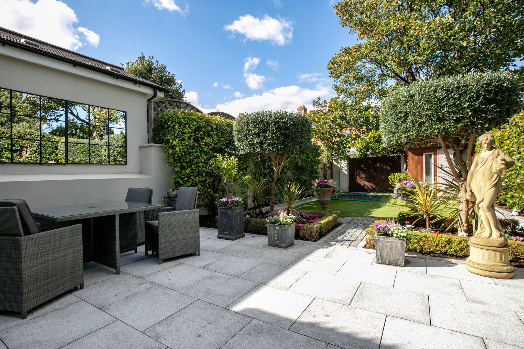 Landscaped garden to the rear with paved patio area, cobble locked border and beds housing a variety of planting, trees shrubs and box hedging. Low maintenance artificial grass with sunken trampoline, mature hedging and rear vehicular access. Shed for storage.