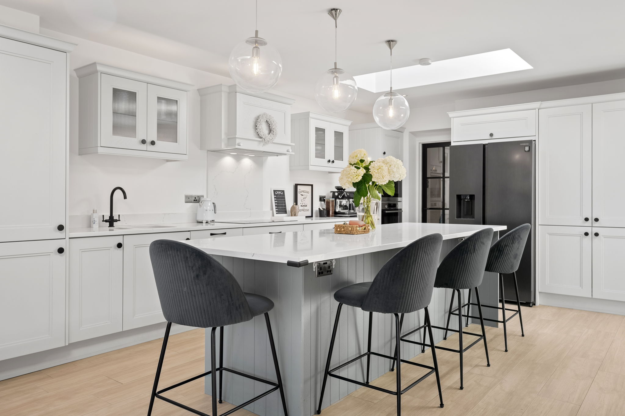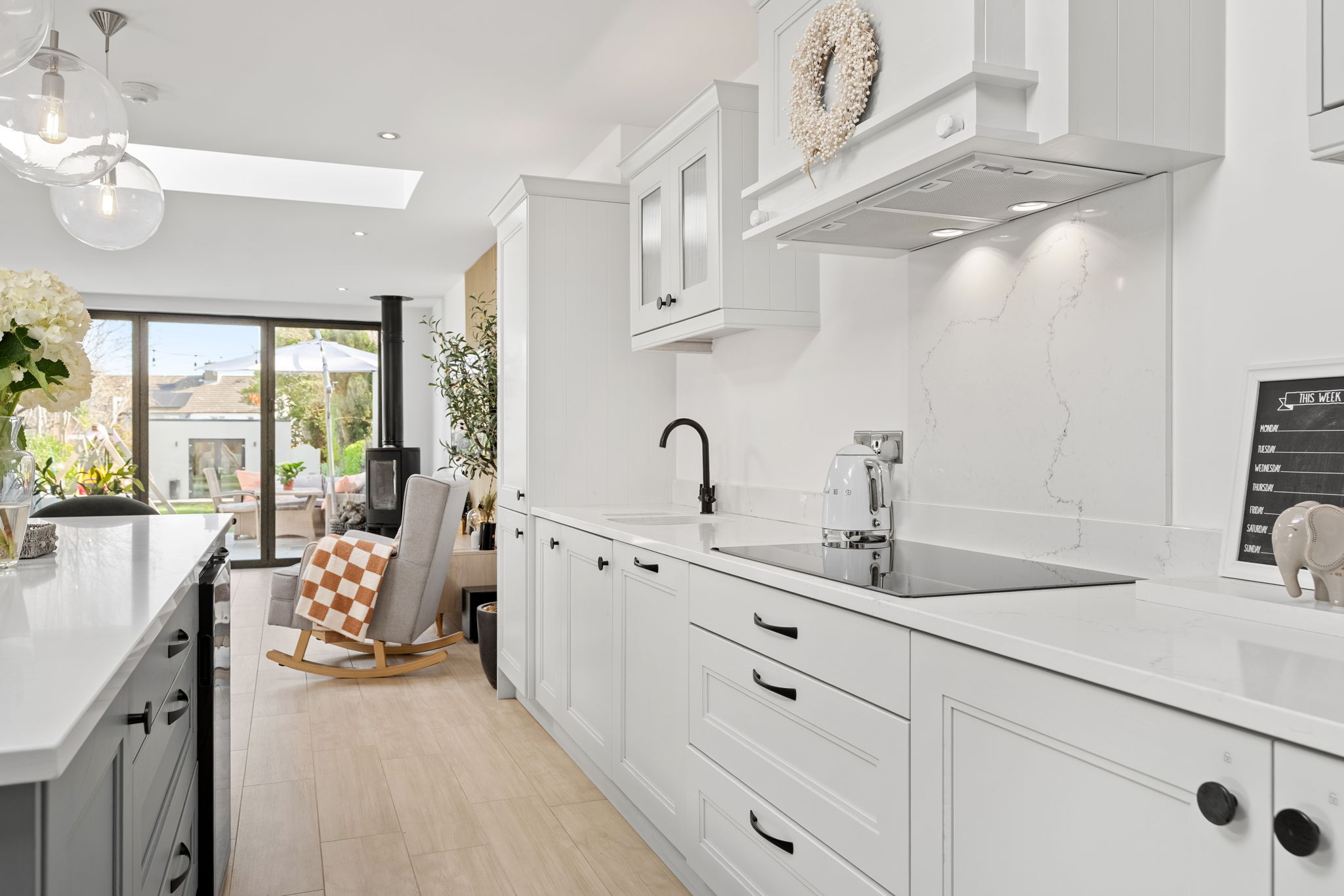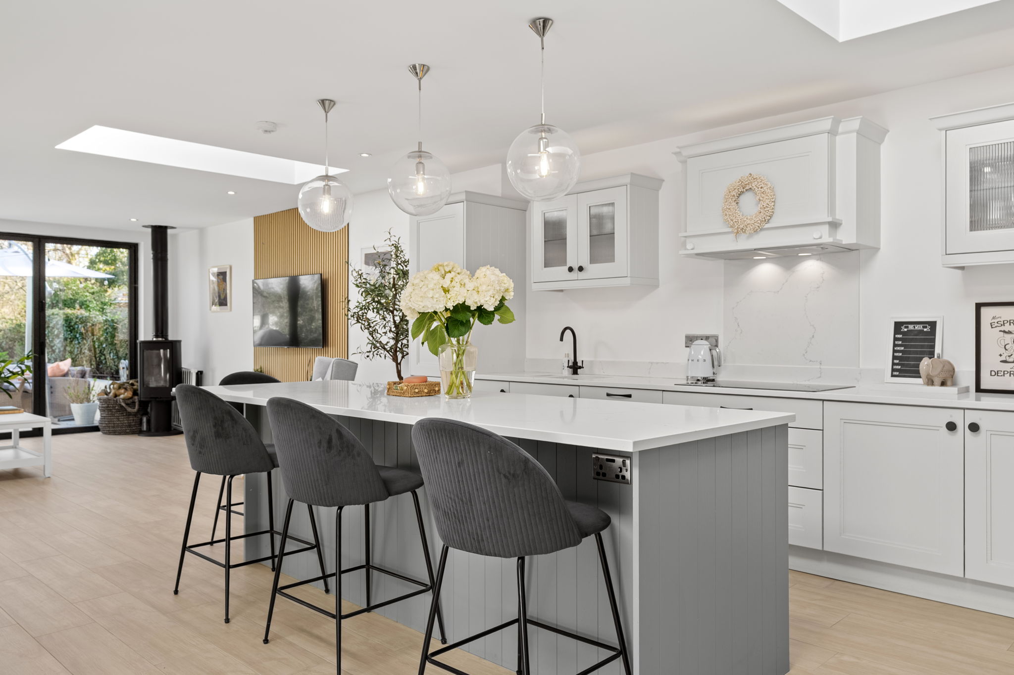 Two large rooflights. A wide range of wooden kitchen units with drawers and cupboards, double pantry unit, 1 1/3 undermount sink unit, extractor fan, plumbed for dishwasher, large island unit with additional storage and breakfast bar seating.