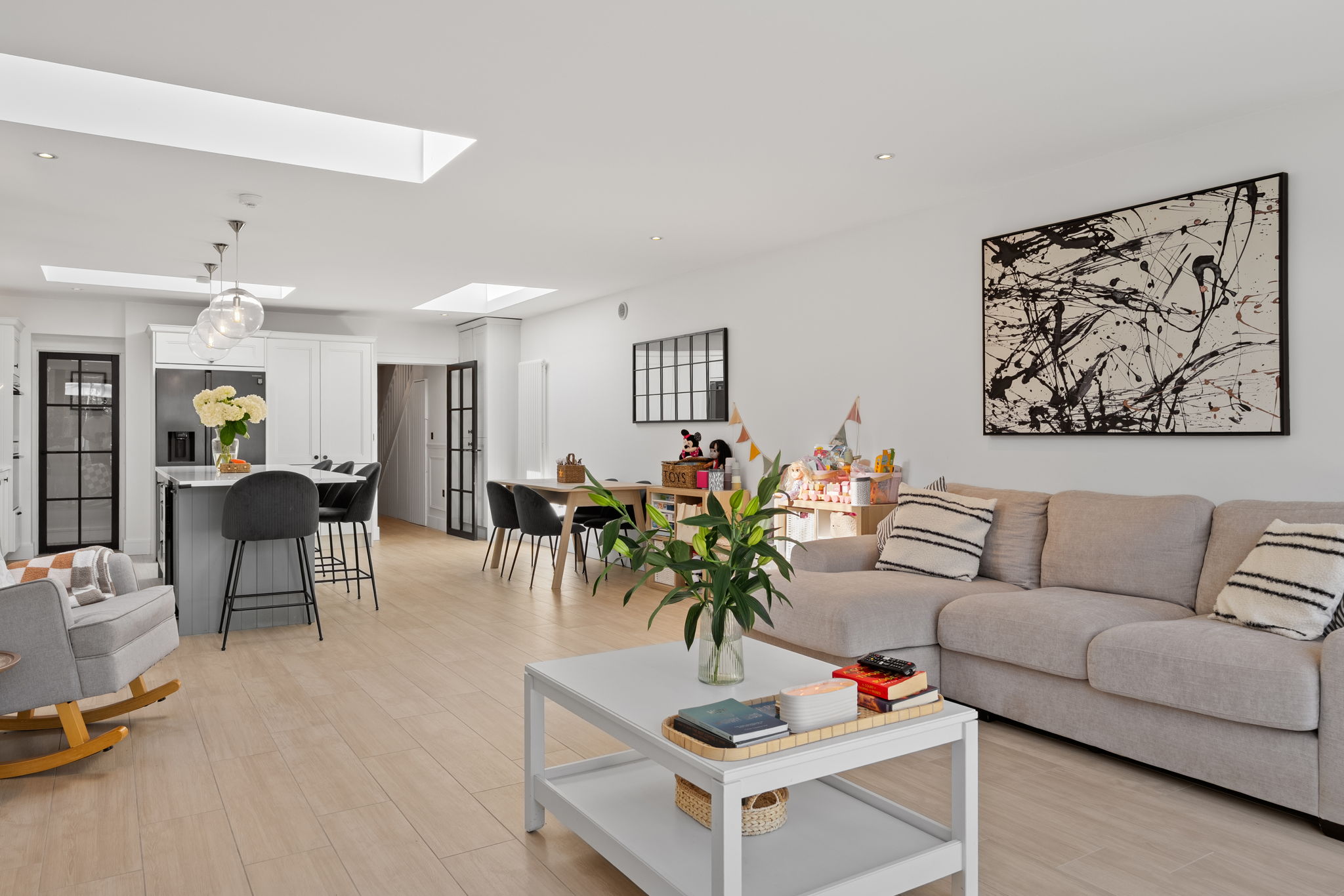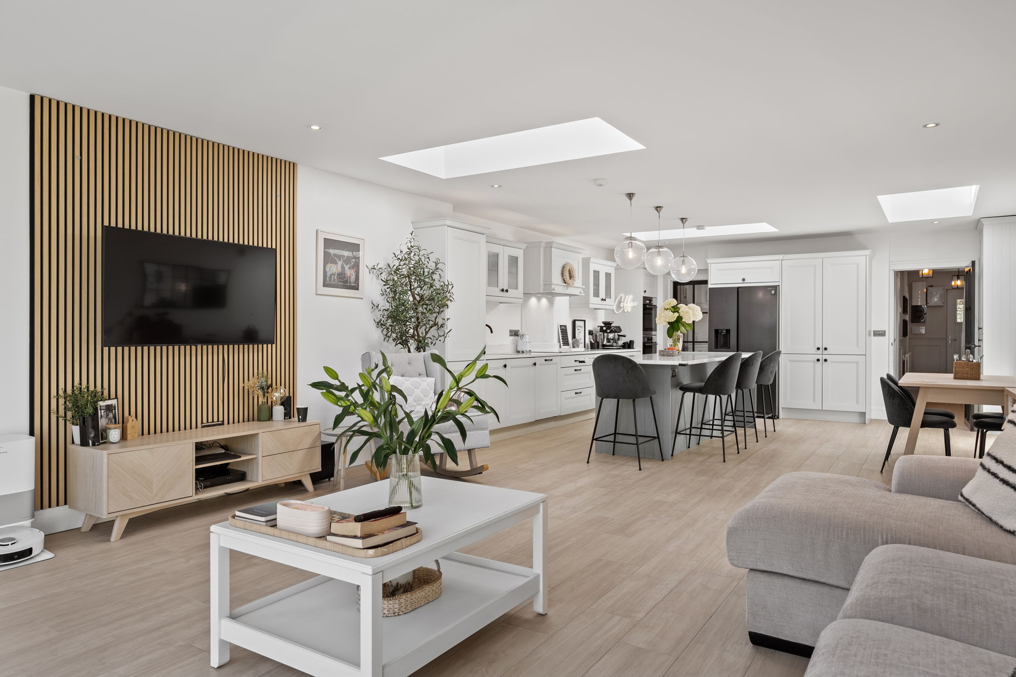 Beyond the hallway is a magnificent open plan kitchen/dining/living room, bursting full of natural light benefitting from the floor to ceiling bifold doors and three rooflights. The kitchen has a wide range of overhead and undercounter wooden units with ample storage, pantry until, 1 1/3 undermount sink unit, extractor fan and large island with further storage and breakfast bar seating. Off the kitchen is the very practical utility room which is plumbed for washing machine/dryer and a fully tiled dog bath with shower attachment. The living area sits in at the end of the property with sealed wood burning stove and floor to ceiling bifold doors opening onto the patio – this is the perfect spot for alfresco dining and entertaining
