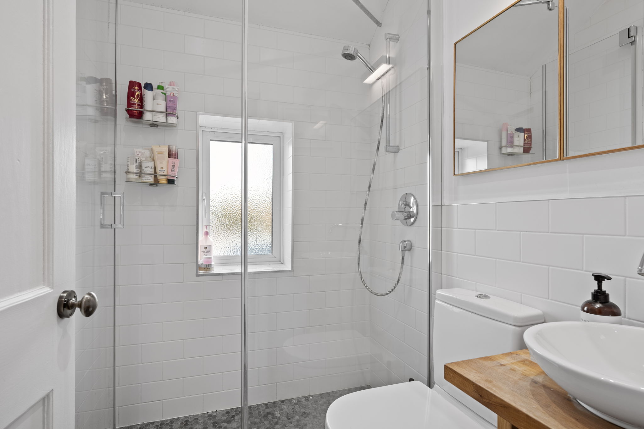 Shower, w.c, whb with storage, towel radiator, tiled floor and part tiled walls.