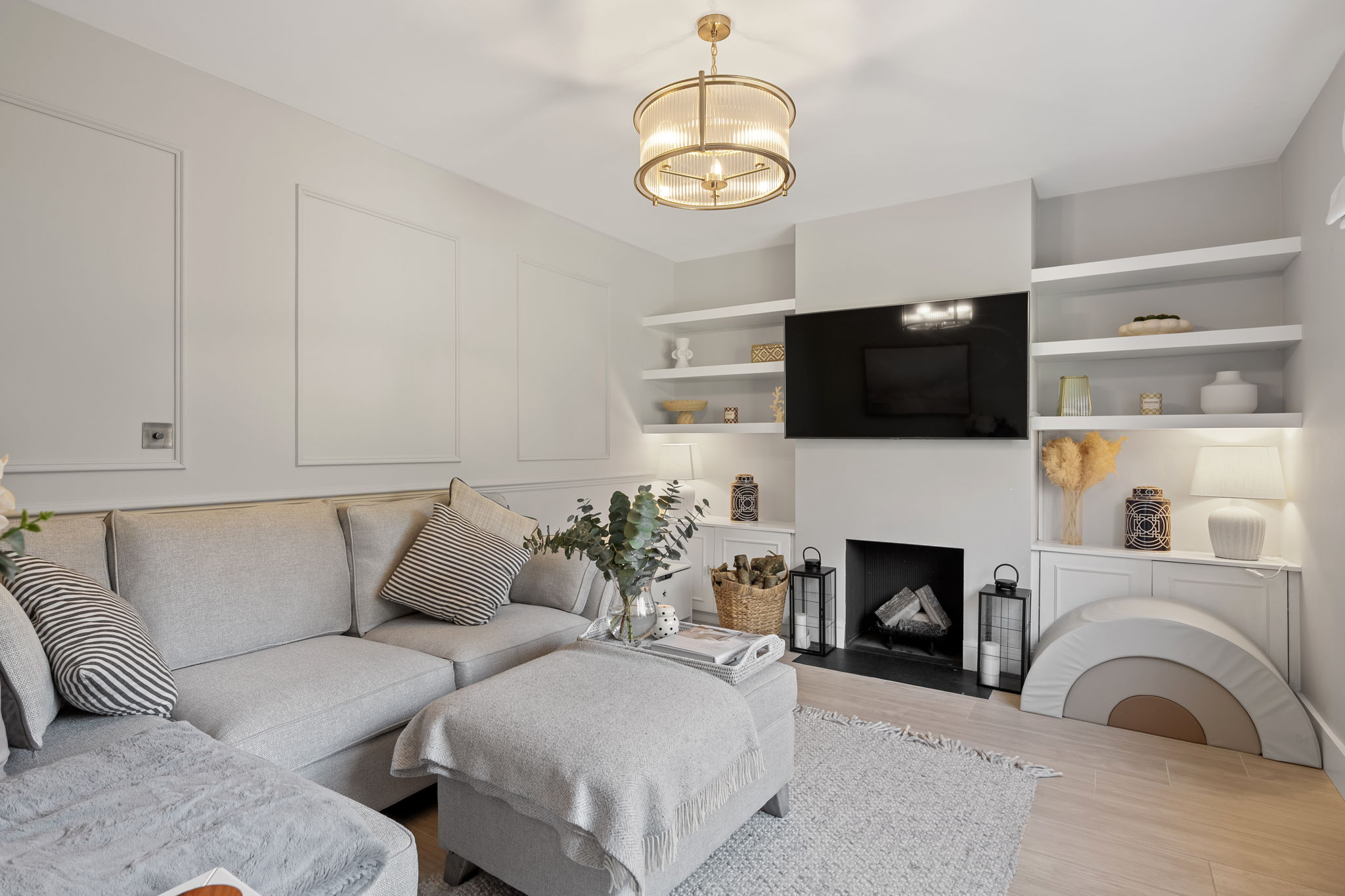 Open fire, alcove shelving and cupboards, wood effect tiled floor and pannelled walls.