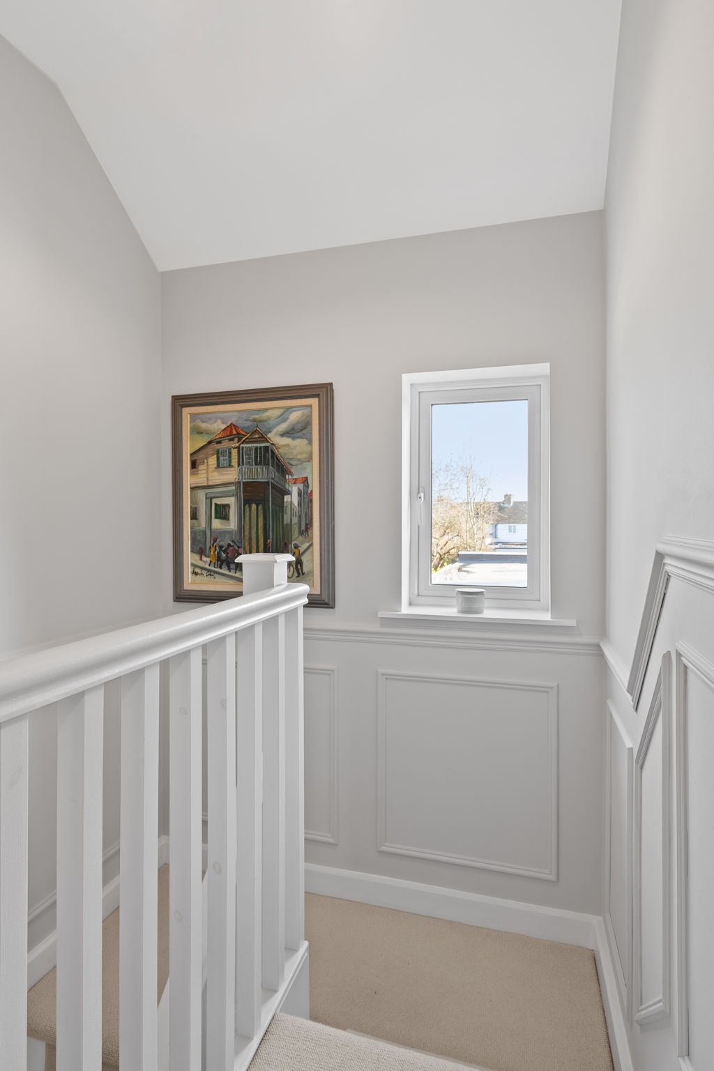 Wood effect tiled floor, pannelled walls and understairs storage.