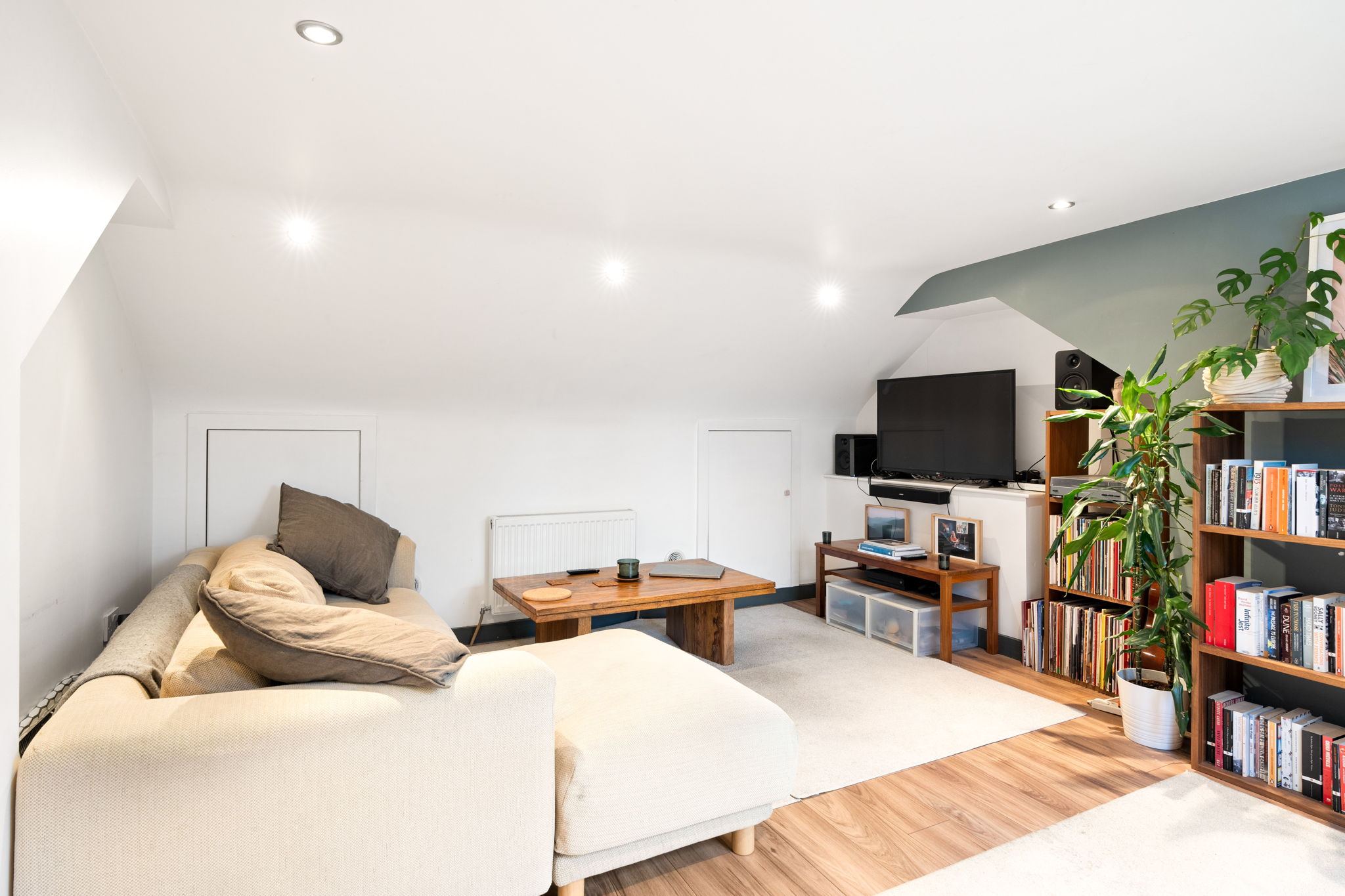 Upstairs, the living area forms the true hub of the home — a bright, inviting space with recessed lighting,ample eaves storage, and French doors opening onto a private roof terrace. To the rear, a charming courtyard garden provides the perfect spot for plants or secure bike storage.