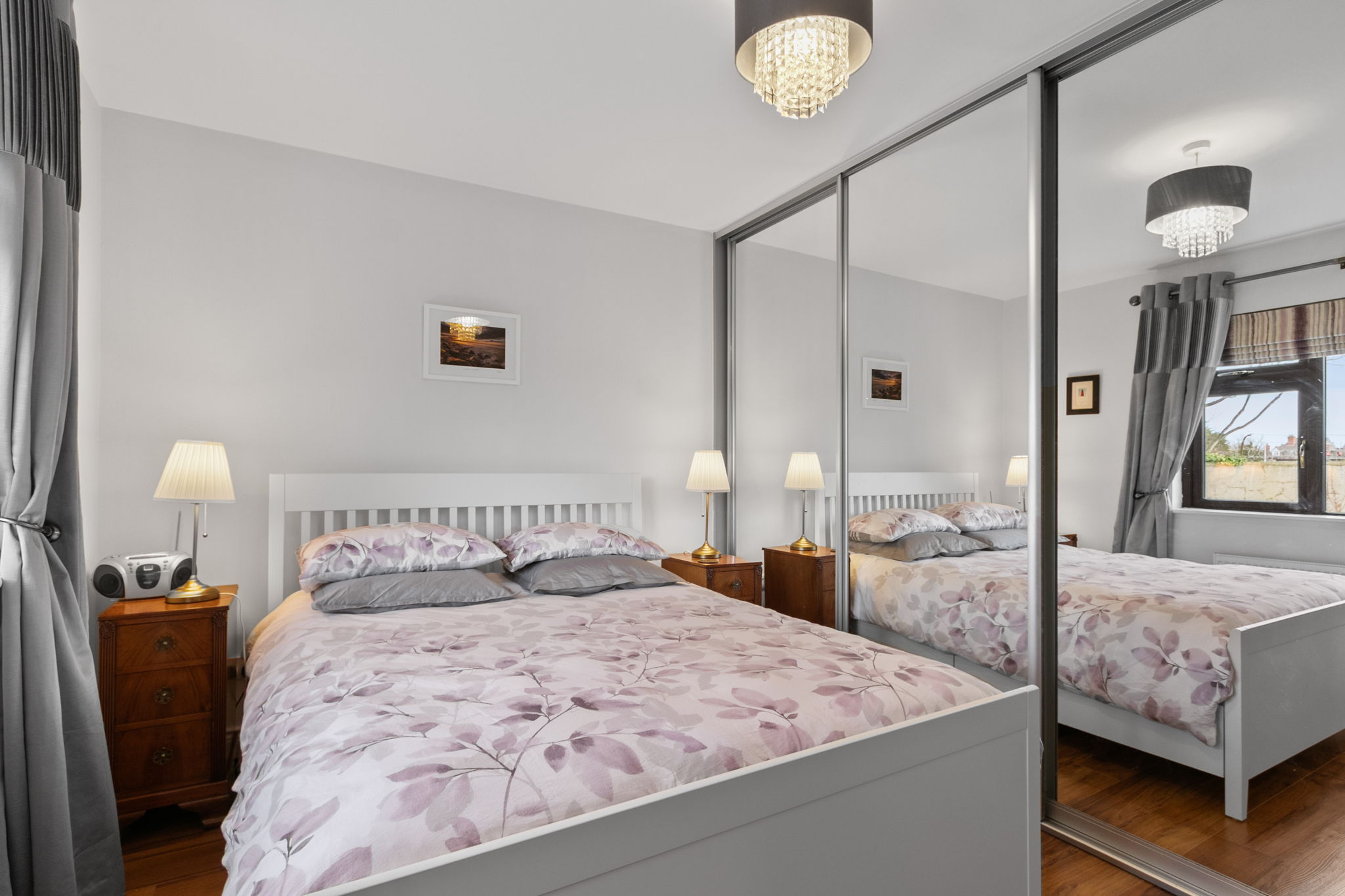 Floor to ceiling mirrored sliderobes with ample storage, laminate wood flooring