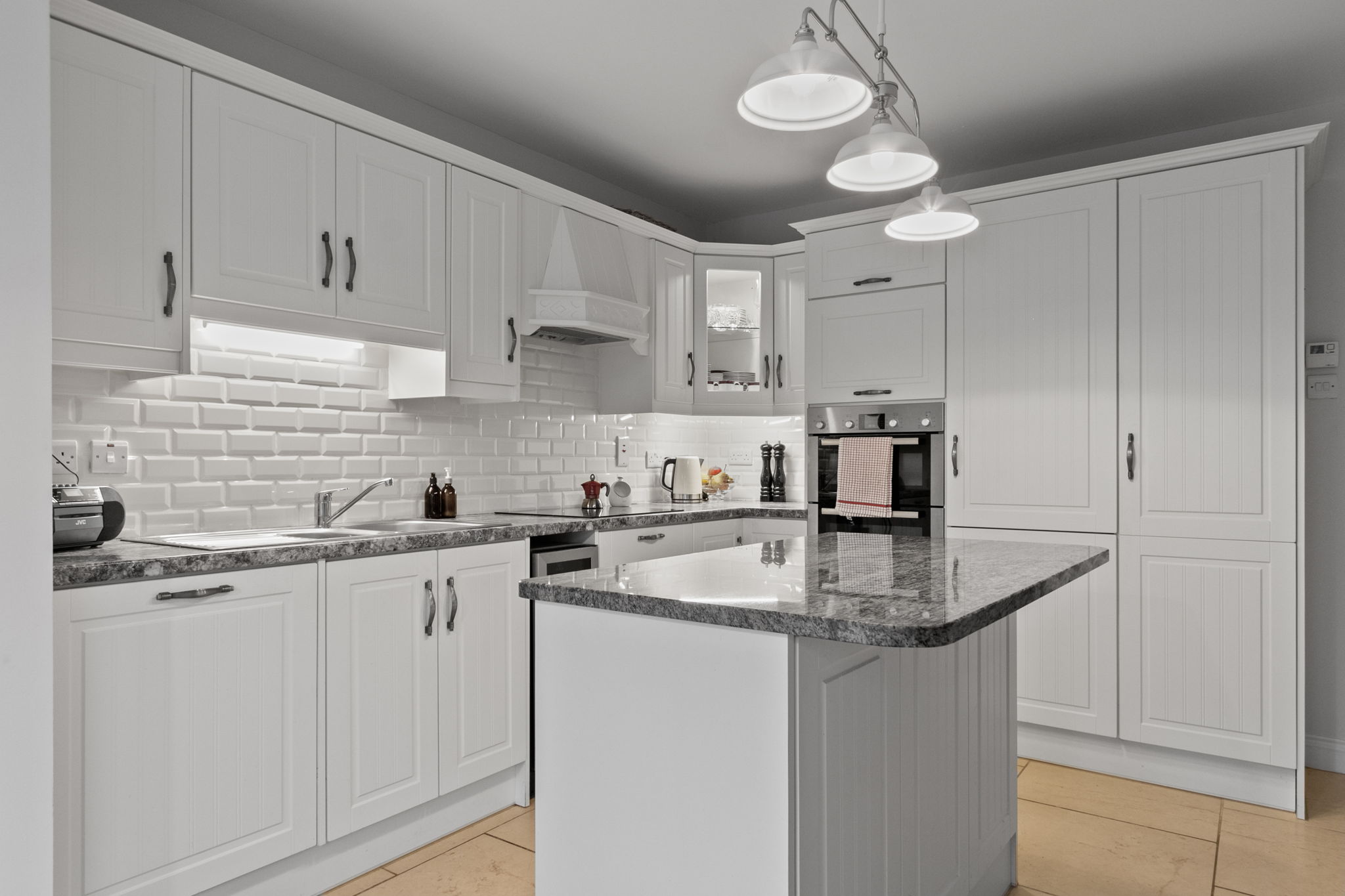 A wide range of shaker style kitchen units, subway tiled backsplash. Island unit with seating and storage finished with a granite worktop. 1 1/3 stainless steel sink, induction hob, extractor, integrated appliances. Tiled floor throughout and double doors leading to the rear garden.