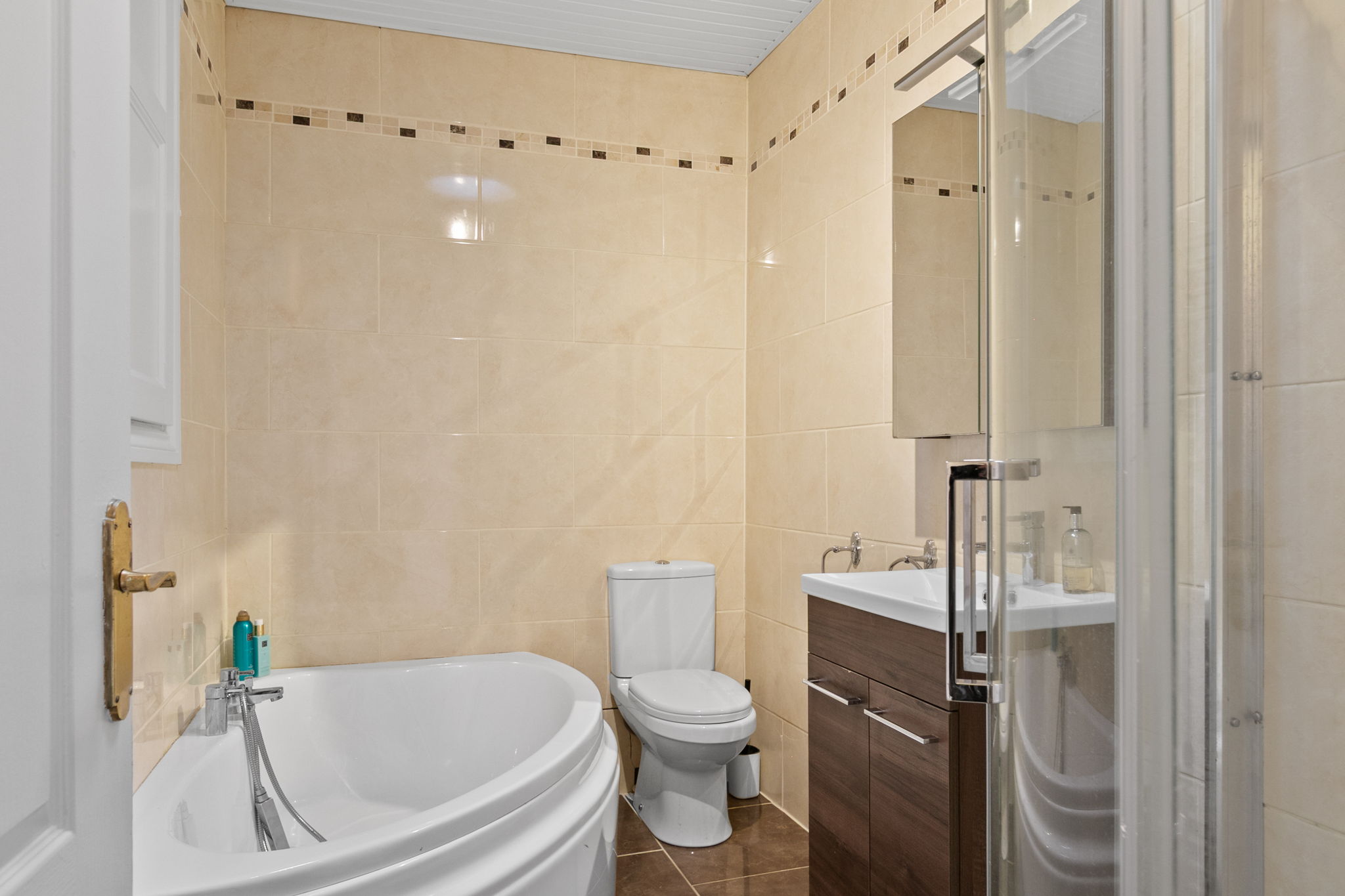 Large corner bath unit, separate electric shower, vanity whb, w.c, mirrored medicine cabinet, towel radiator, fully tiled. Hot press off the bathroom with shelving for storage.