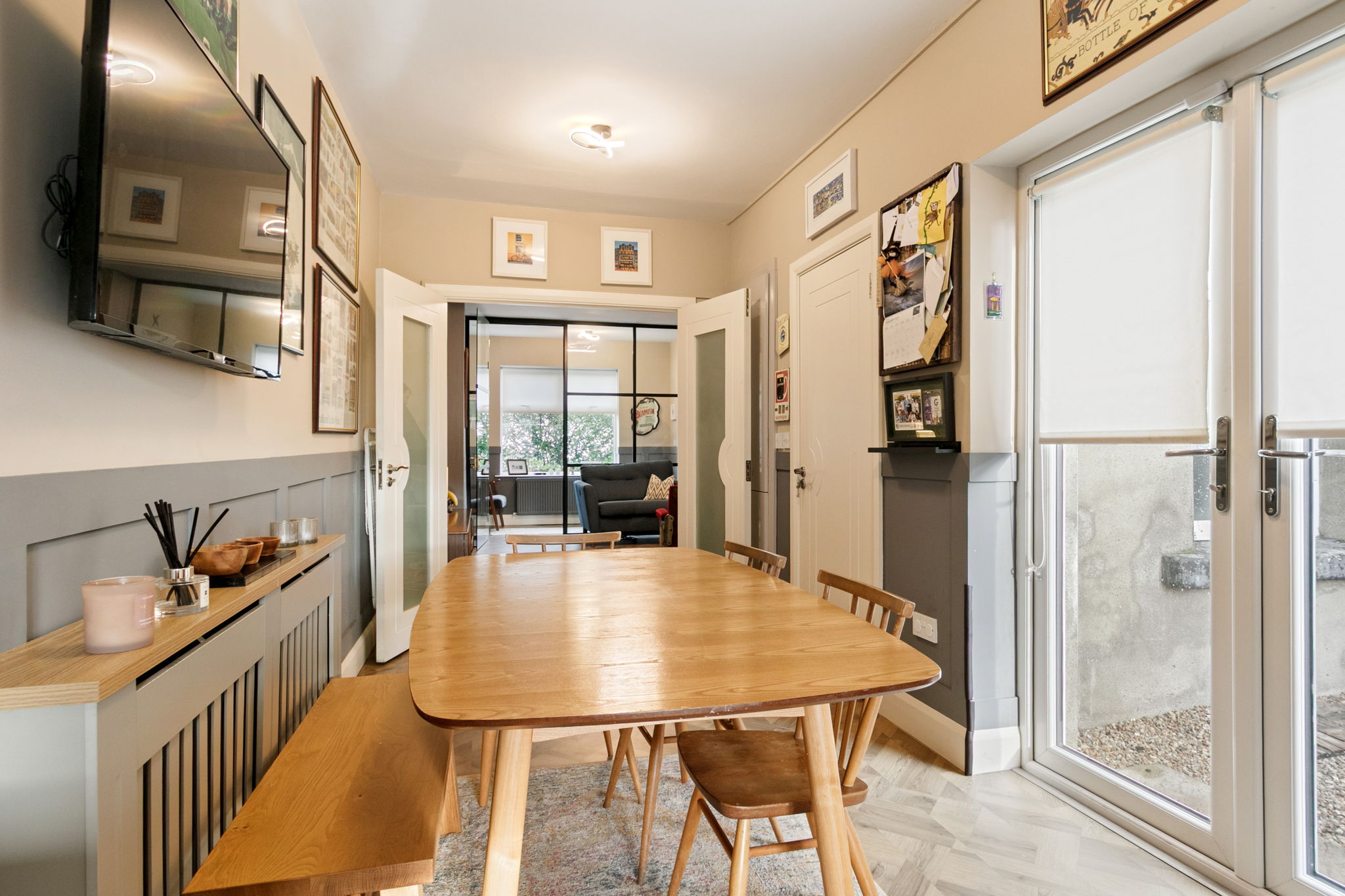 Herringbone laminate floor, panelled walls, hot press and storage off. Double doors leading to the dining area.