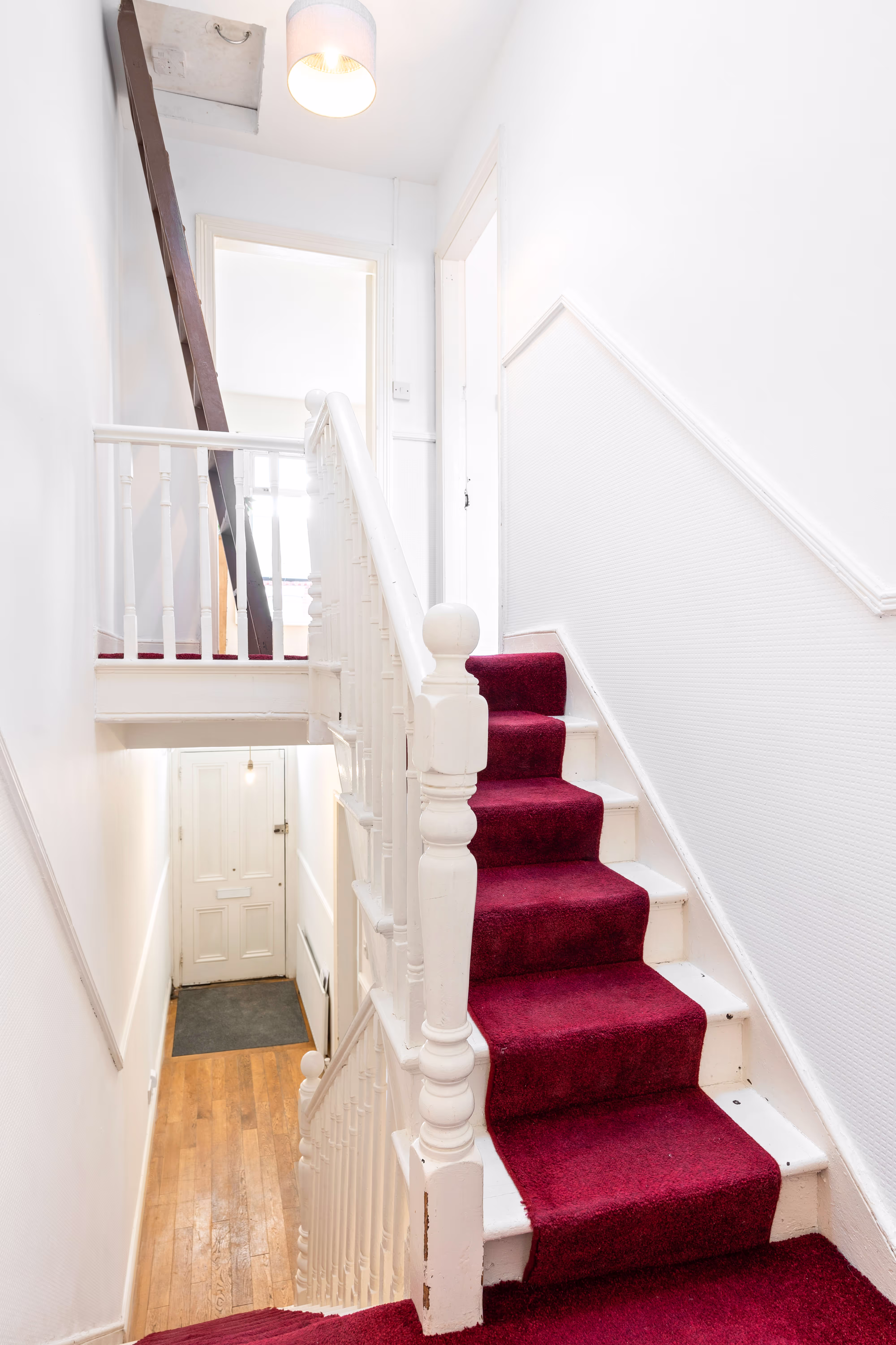Upstairs, on the return, is the bathroom with bath, separate overhead power shower, w.c, whb, storage and tiled floors. The spacious master bedroom runs the width of the house with original wood flooring and original cast iron fireplace. The second bedroom is at the rear of the house and also has original wood flooring and built in wardrobes.