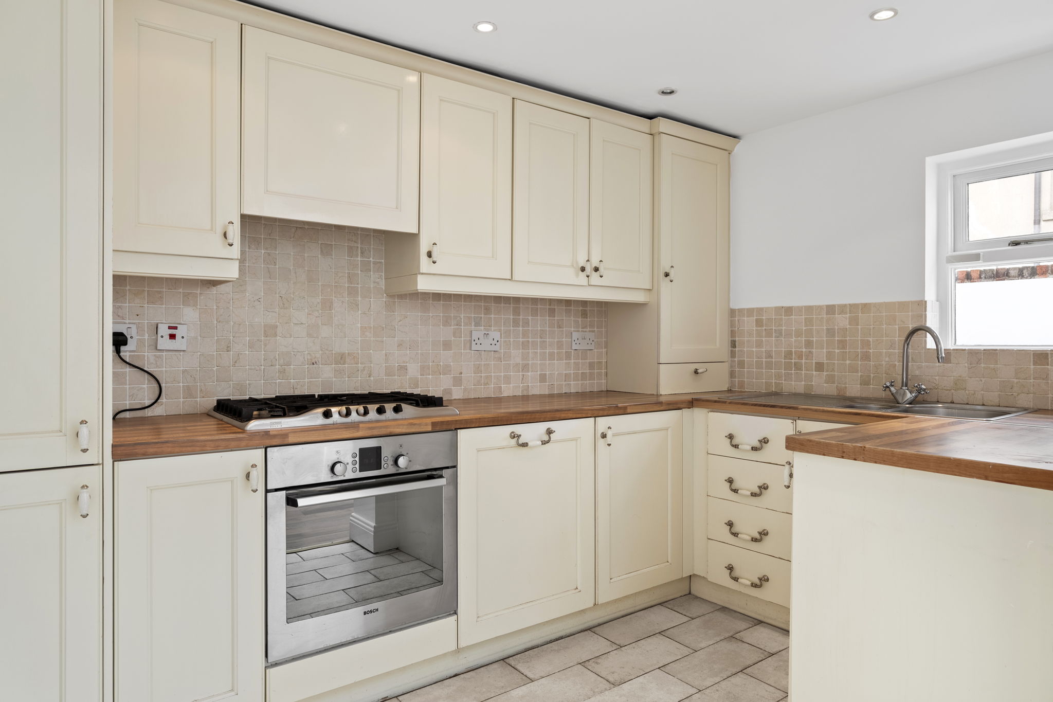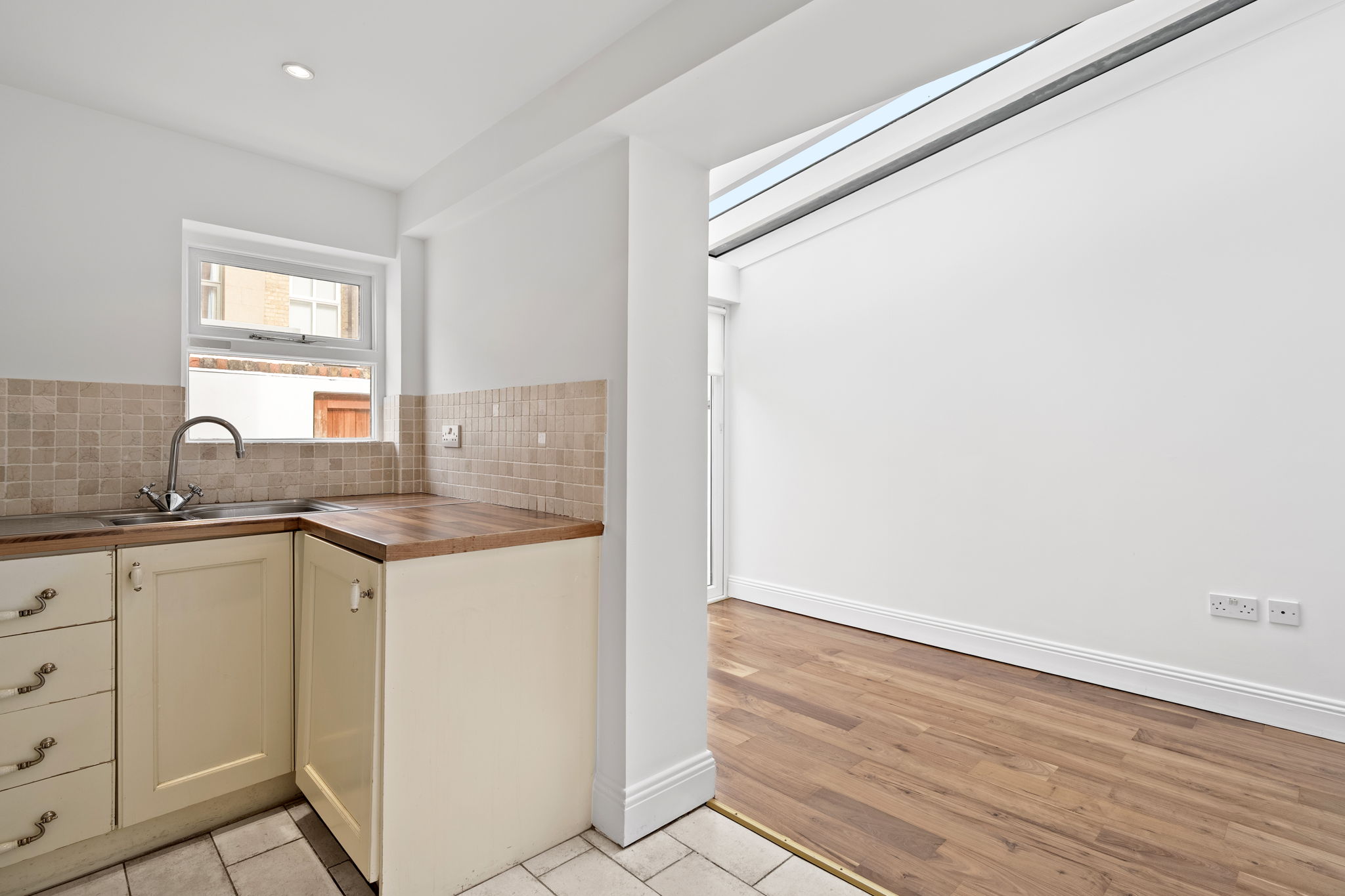 Wide range of overhead and undercounter units, extractor fan, sink unit, tiled floor and part tiled walls.
