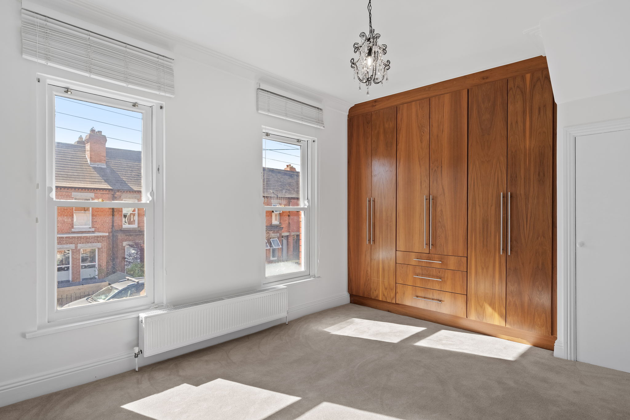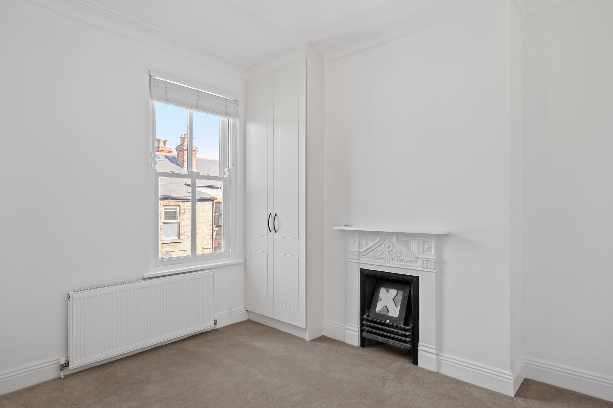 Ornate cast iron mantlepiece, ceiling coving and fitted wardrobe.